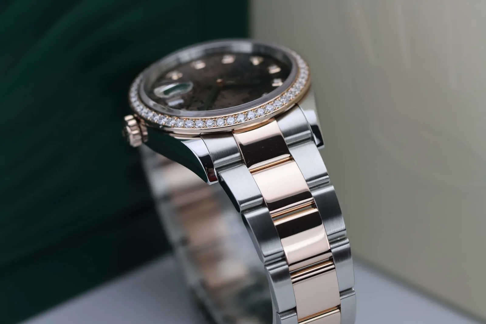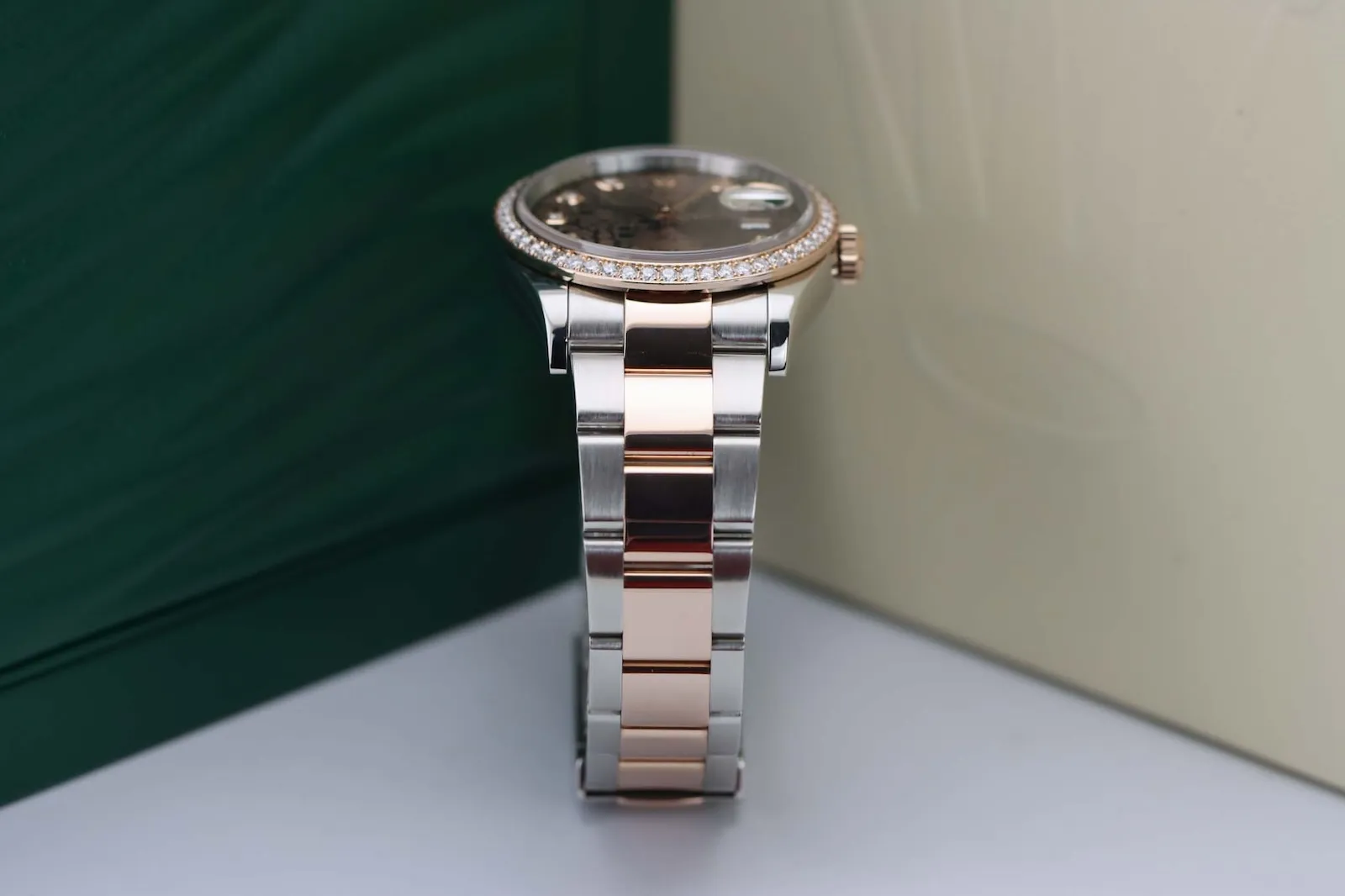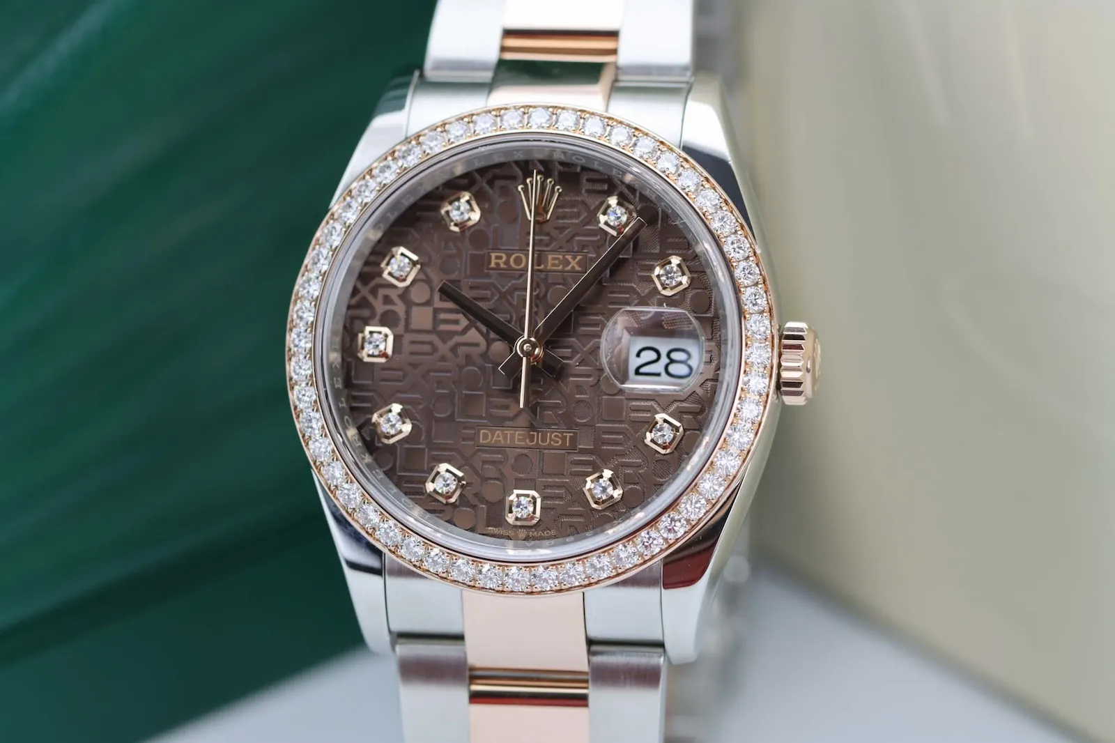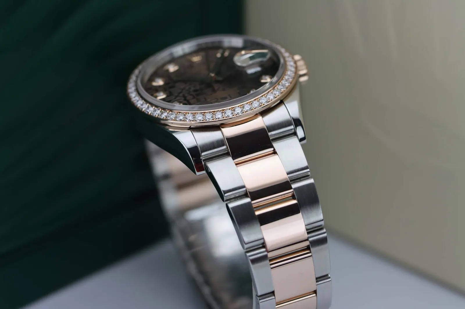 This Rolex Datejust 36, reference 126281RBR, blends steel and Everose gold in a timeless 36mm case, featuring a factory-set diamond bezel and a chocolate brown anniversary dial with diamond hour markers. Powered by Rolex’s automatic calibre 3235, it delivers around 70 hours of power reserve and includes a date display under the signature Cyclops lens. The watch is water-resistant to 100 metres and fitted with a sapphire crystal (scratch-resistant glass). It comes as a full set with original box, warranty card dated 2021, booklet, and full complement of links.