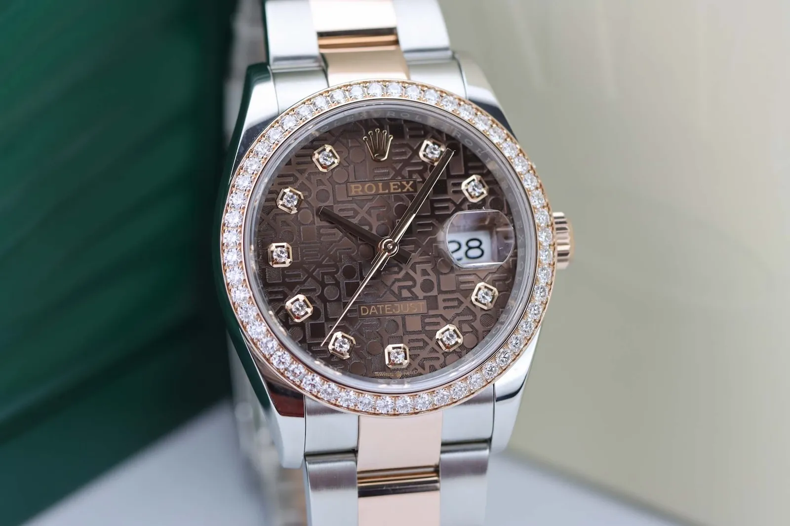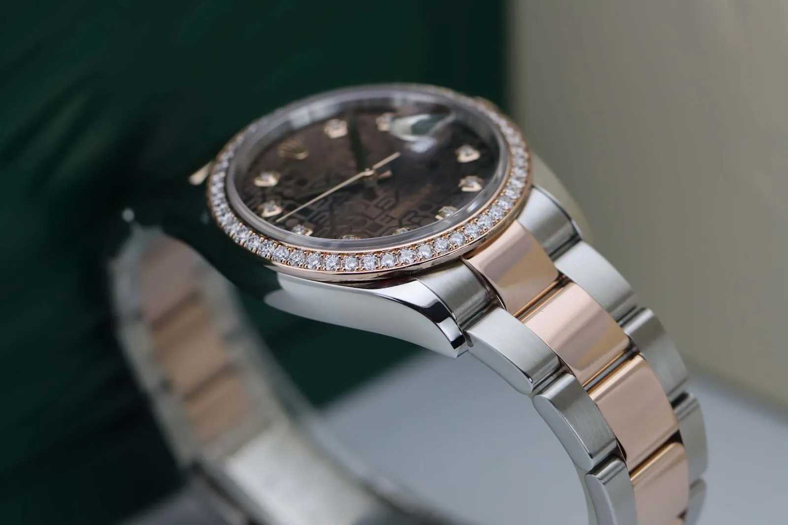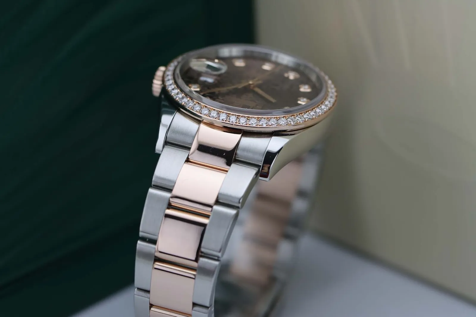 This Rolex Datejust 36, reference 126281RBR, blends steel and Everose gold in a timeless 36mm case, featuring a factory-set diamond bezel and a chocolate brown anniversary dial with diamond hour markers. Powered by Rolex’s automatic calibre 3235, it delivers around 70 hours of power reserve and includes a date display under the signature Cyclops lens. The watch is water-resistant to 100 metres and fitted with a sapphire crystal (scratch-resistant glass). It comes as a full set with original box, warranty card dated 2021, booklet, and full complement of links.