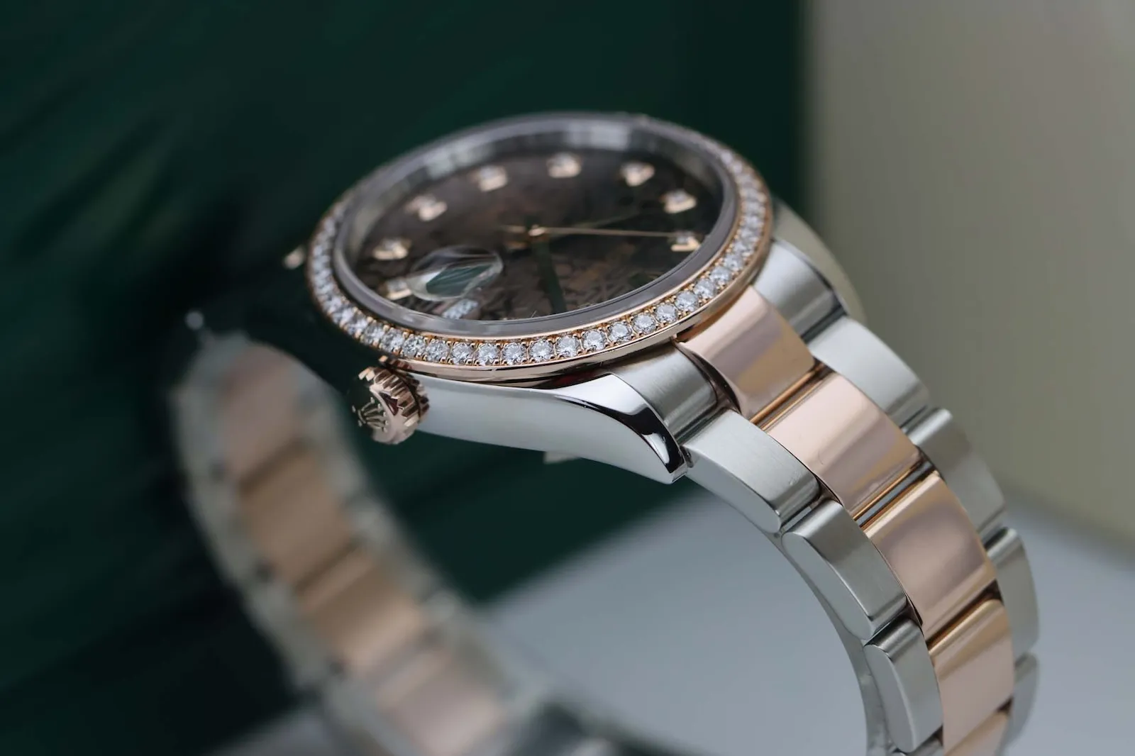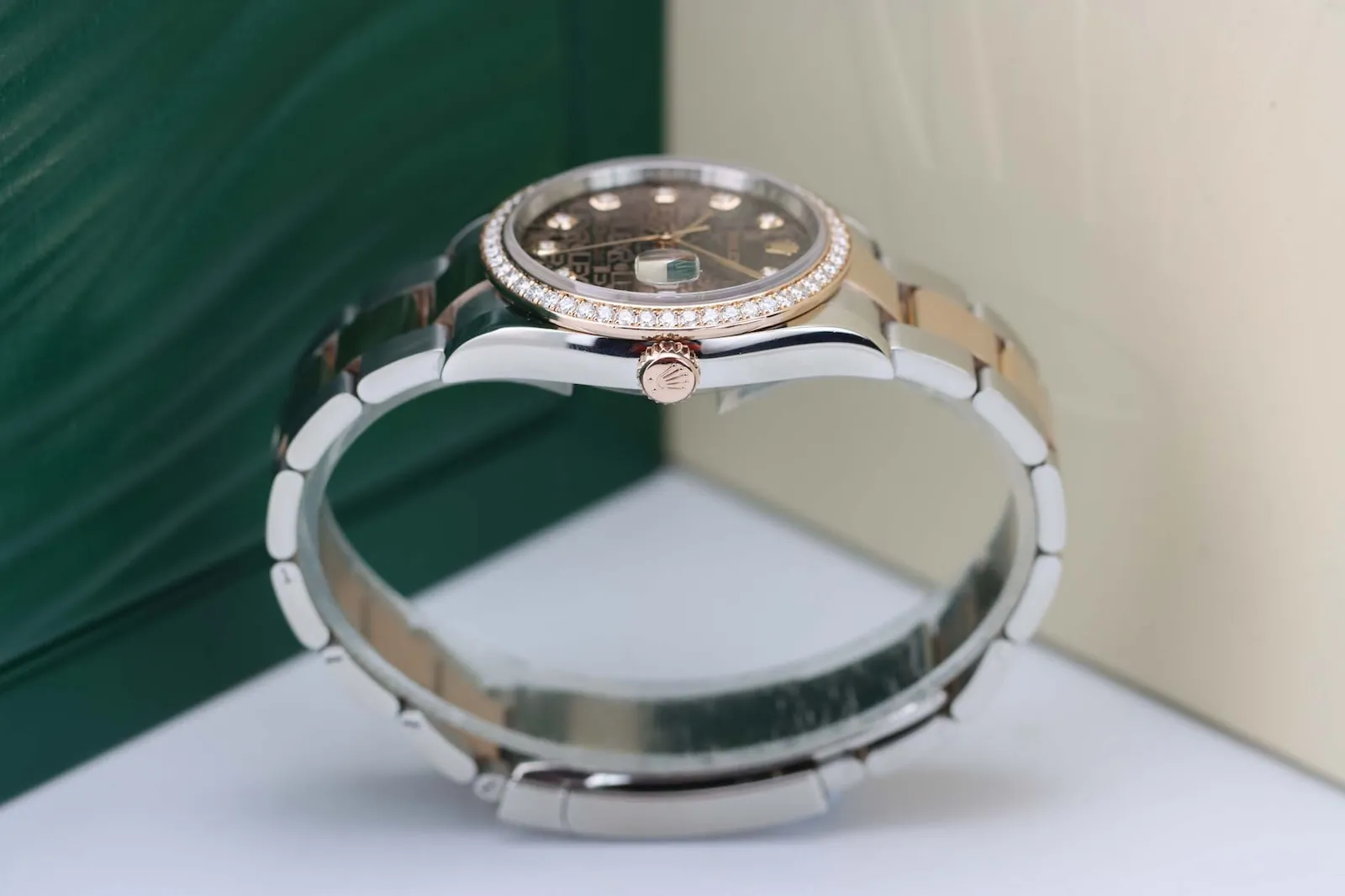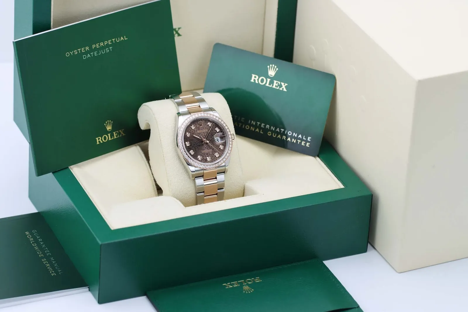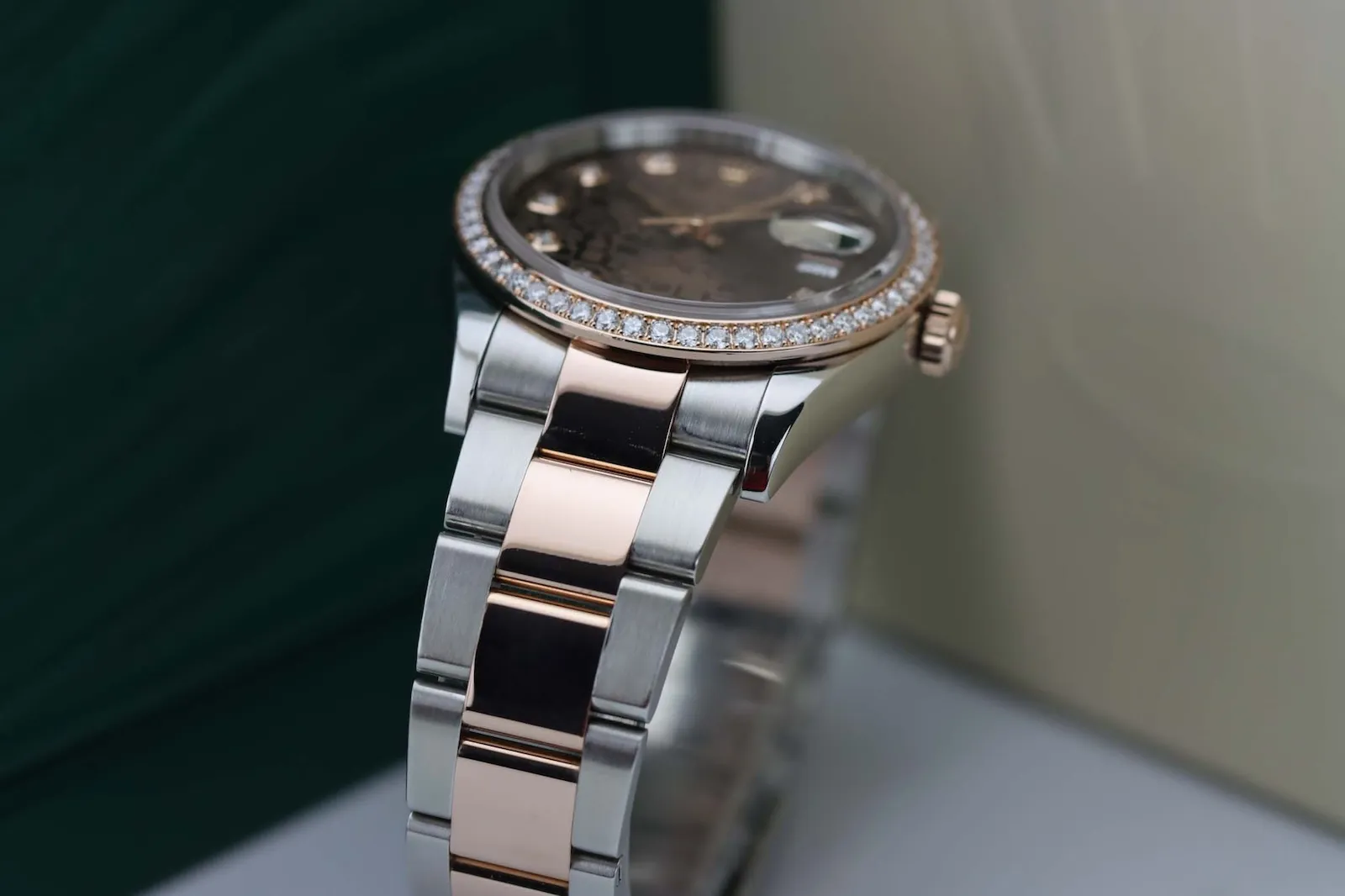 This Rolex Datejust 36, reference 126281RBR, blends steel and Everose gold in a timeless 36mm case, featuring a factory-set diamond bezel and a chocolate brown anniversary dial with diamond hour markers. Powered by Rolex’s automatic calibre 3235, it delivers around 70 hours of power reserve and includes a date display under the signature Cyclops lens. The watch is water-resistant to 100 metres and fitted with a sapphire crystal (scratch-resistant glass). It comes as a full set with original box, warranty card dated 2021, booklet, and full complement of links.