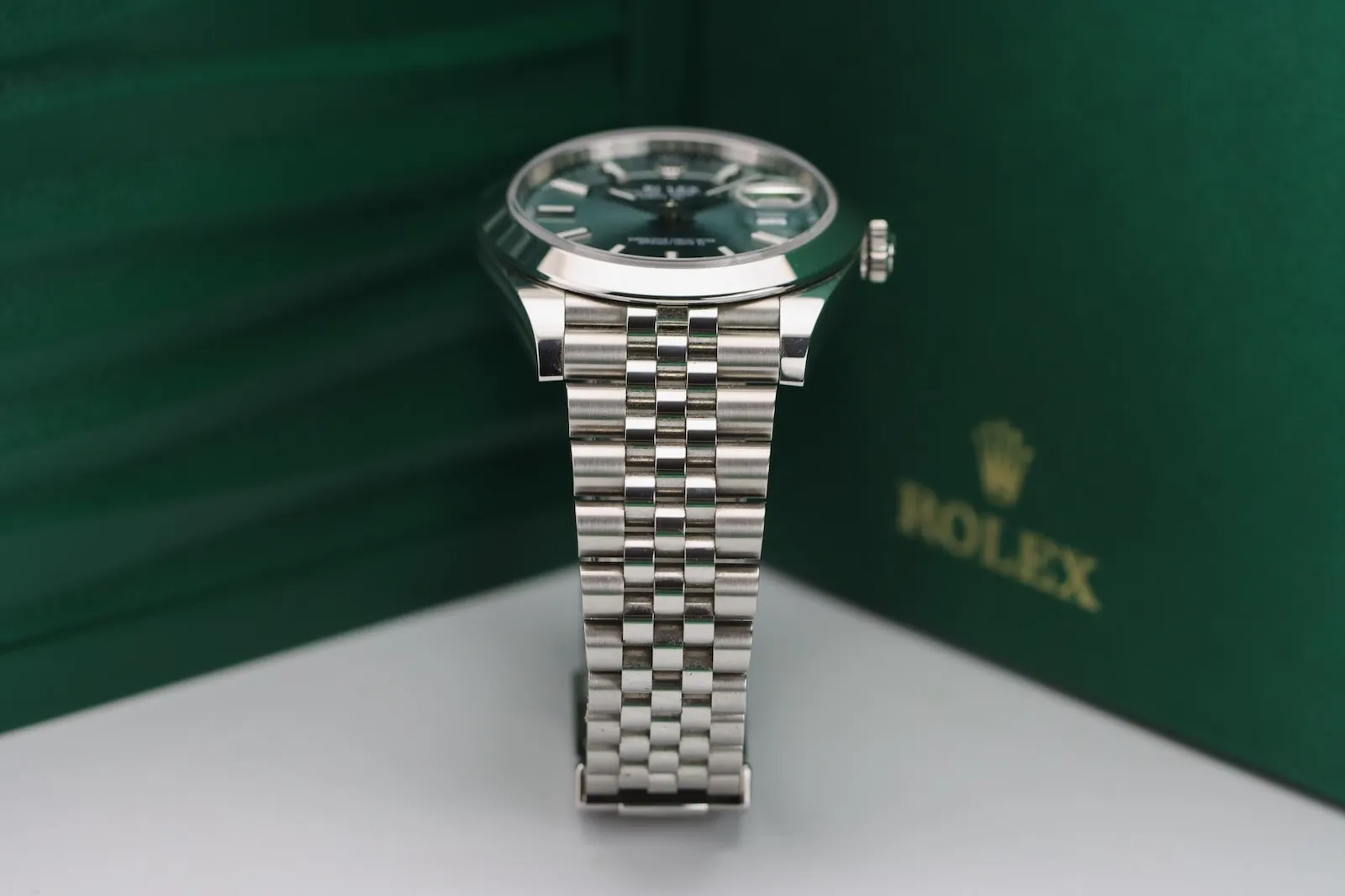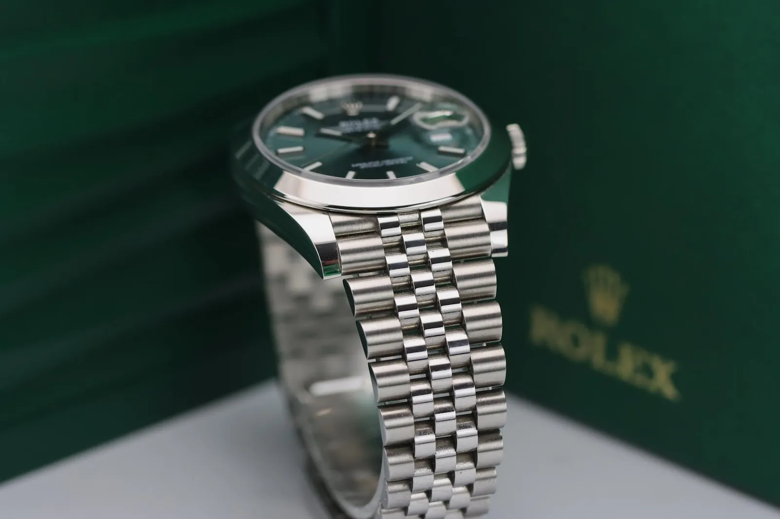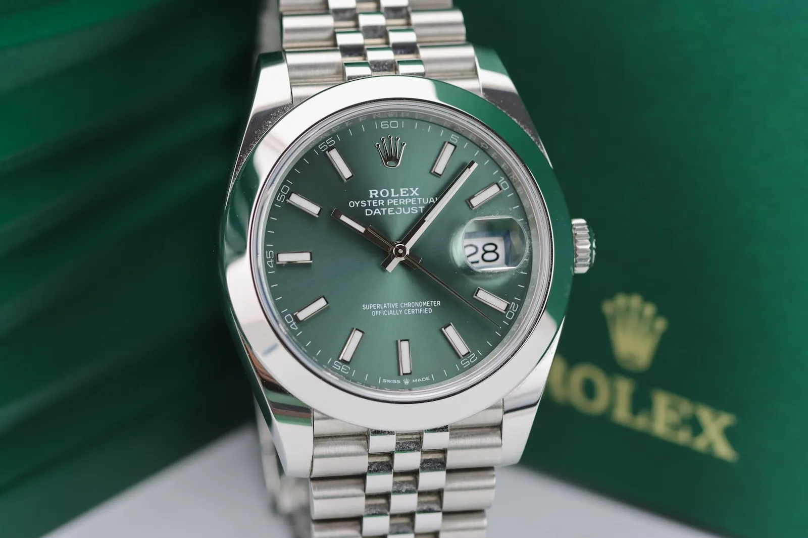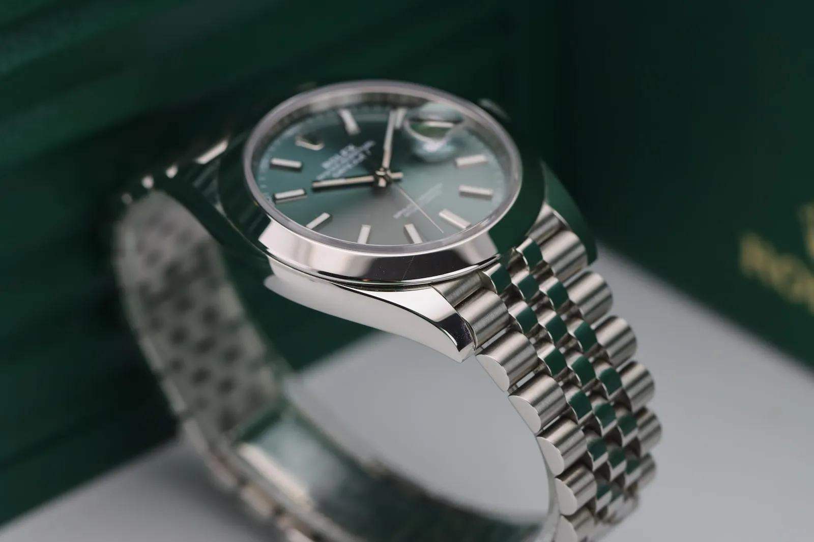 The Rolex Datejust 41 reference 126300 with the mint green dial is one of the most popular and striking modern variations in the Datejust collection. Crafted from stainless steel with a 41mm Oyster case, smooth bezel, and Jubilee bracelet, it perfectly balances everyday luxury and timeless Rolex design.