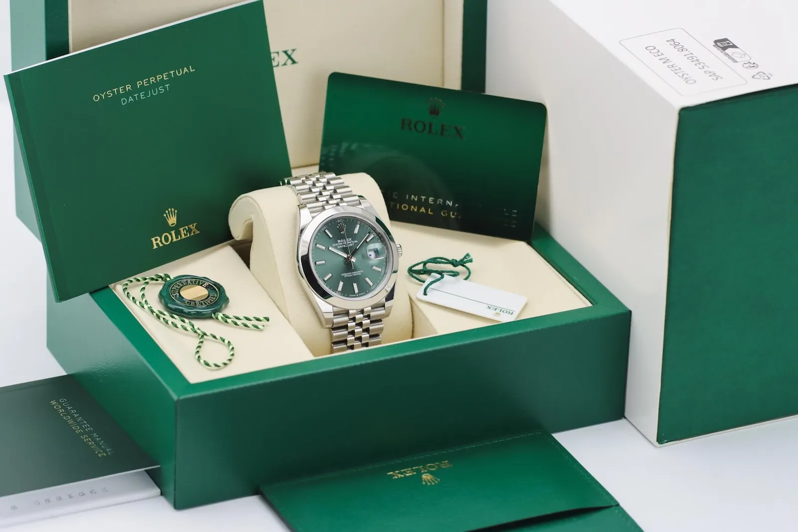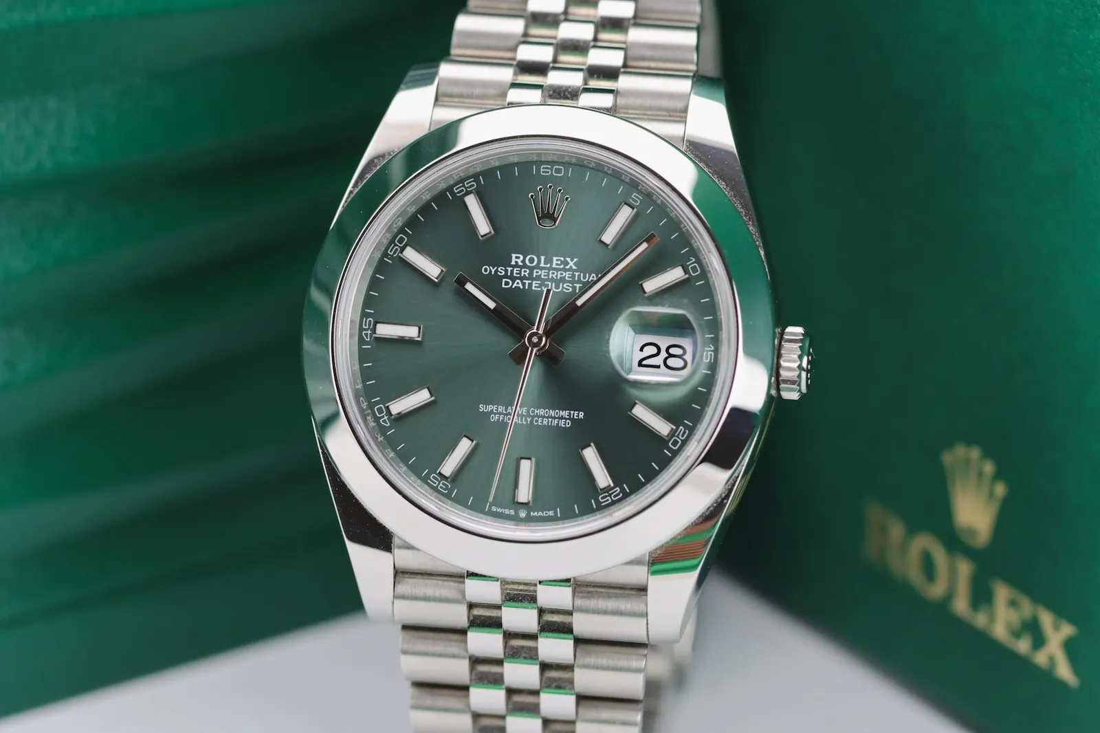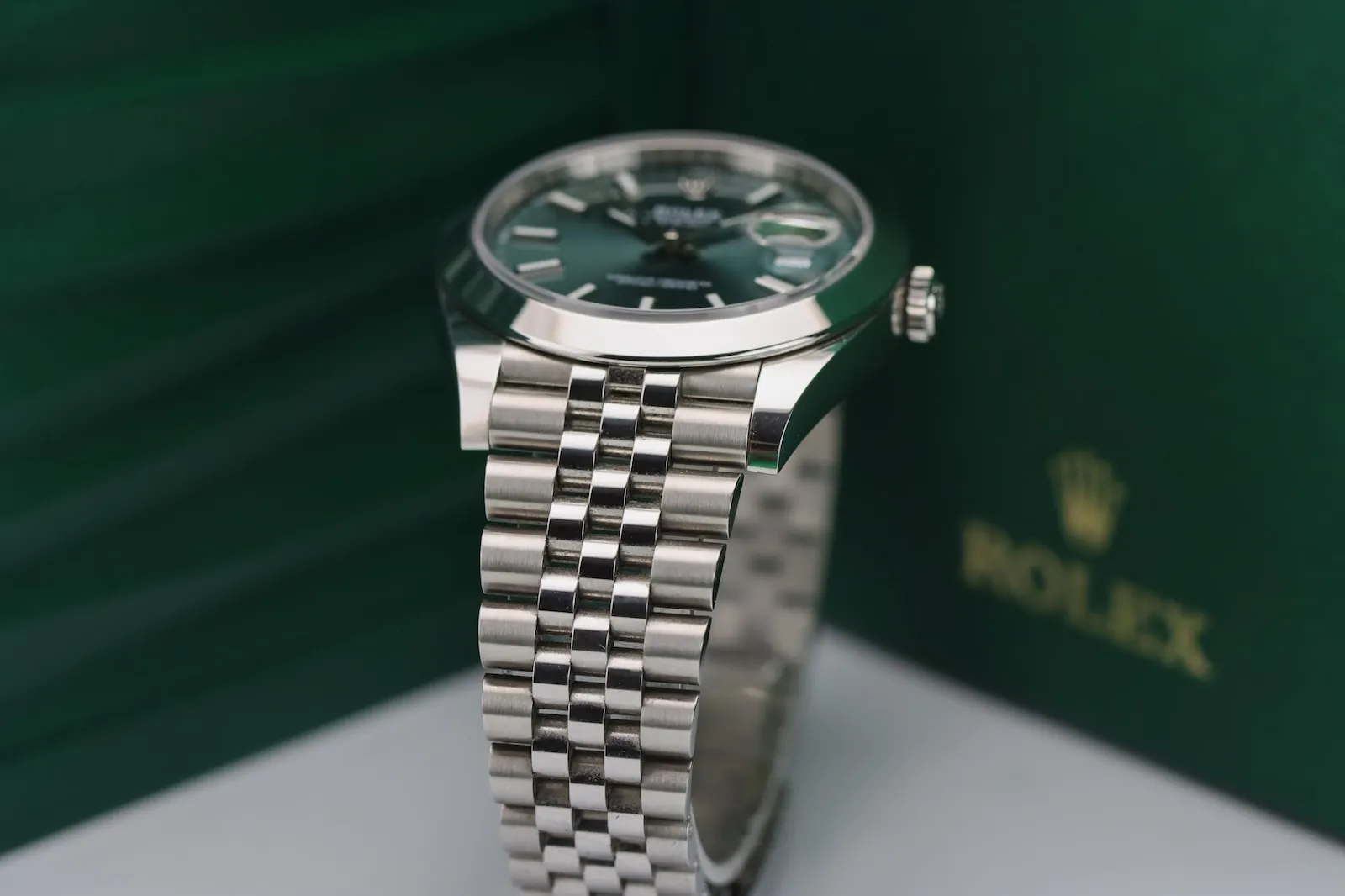 The Rolex Datejust 41 reference 126300 with the mint green dial is one of the most popular and striking modern variations in the Datejust collection. Crafted from stainless steel with a 41mm Oyster case, smooth bezel, and Jubilee bracelet, it perfectly balances everyday luxury and timeless Rolex design.
