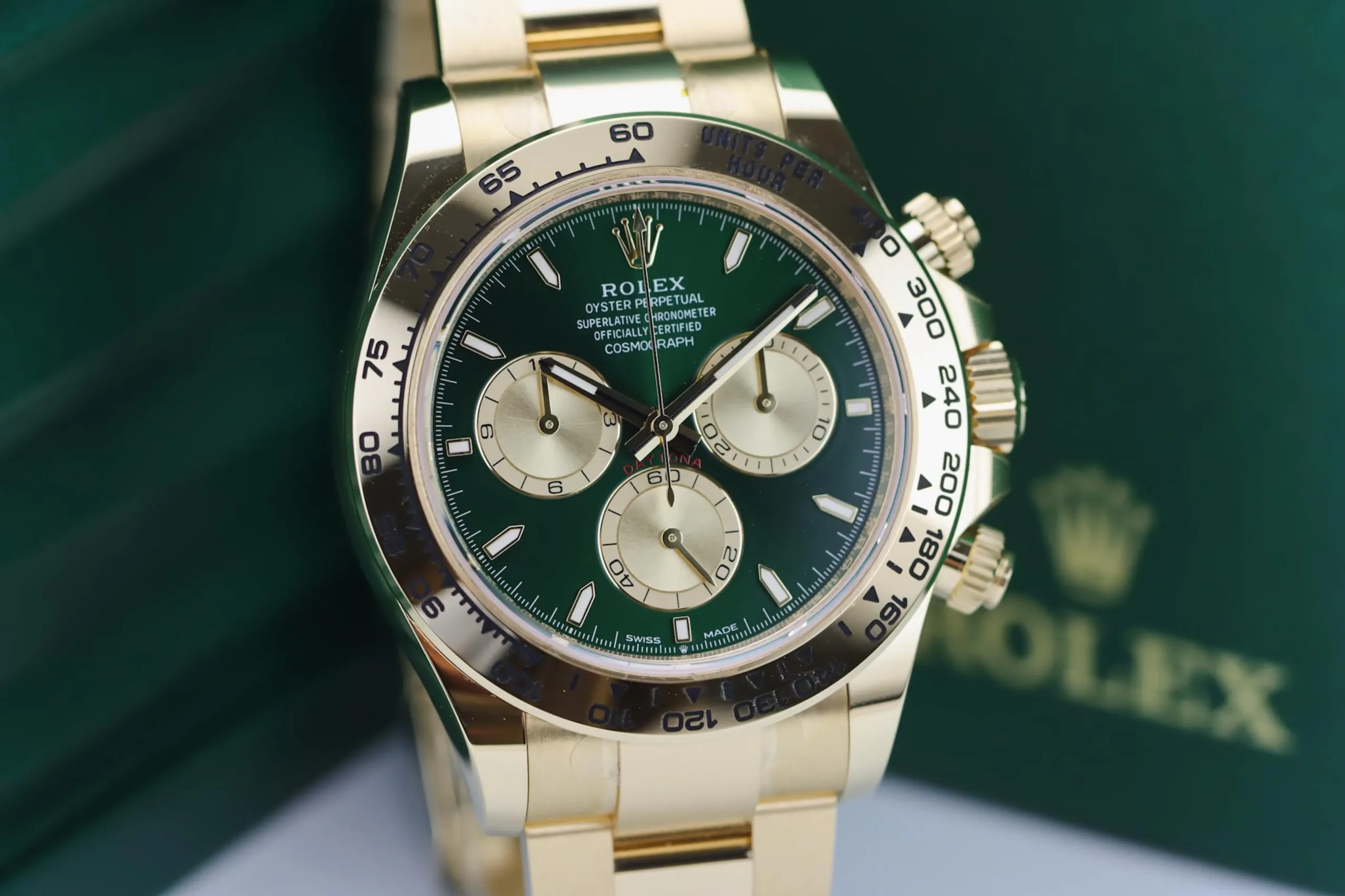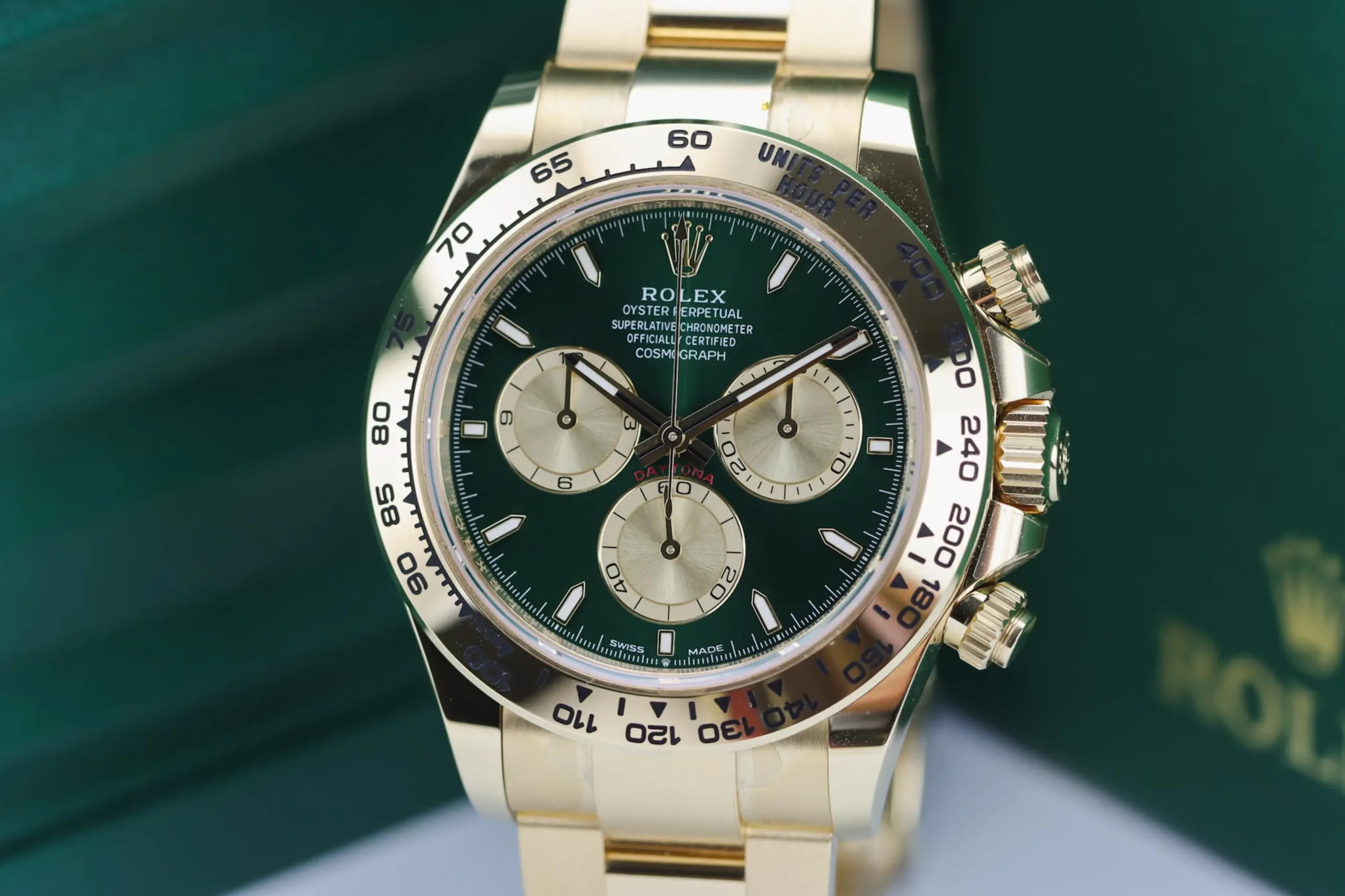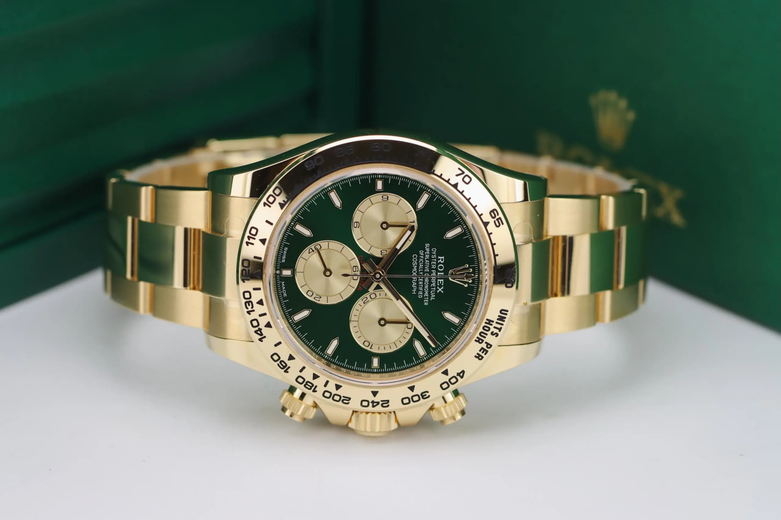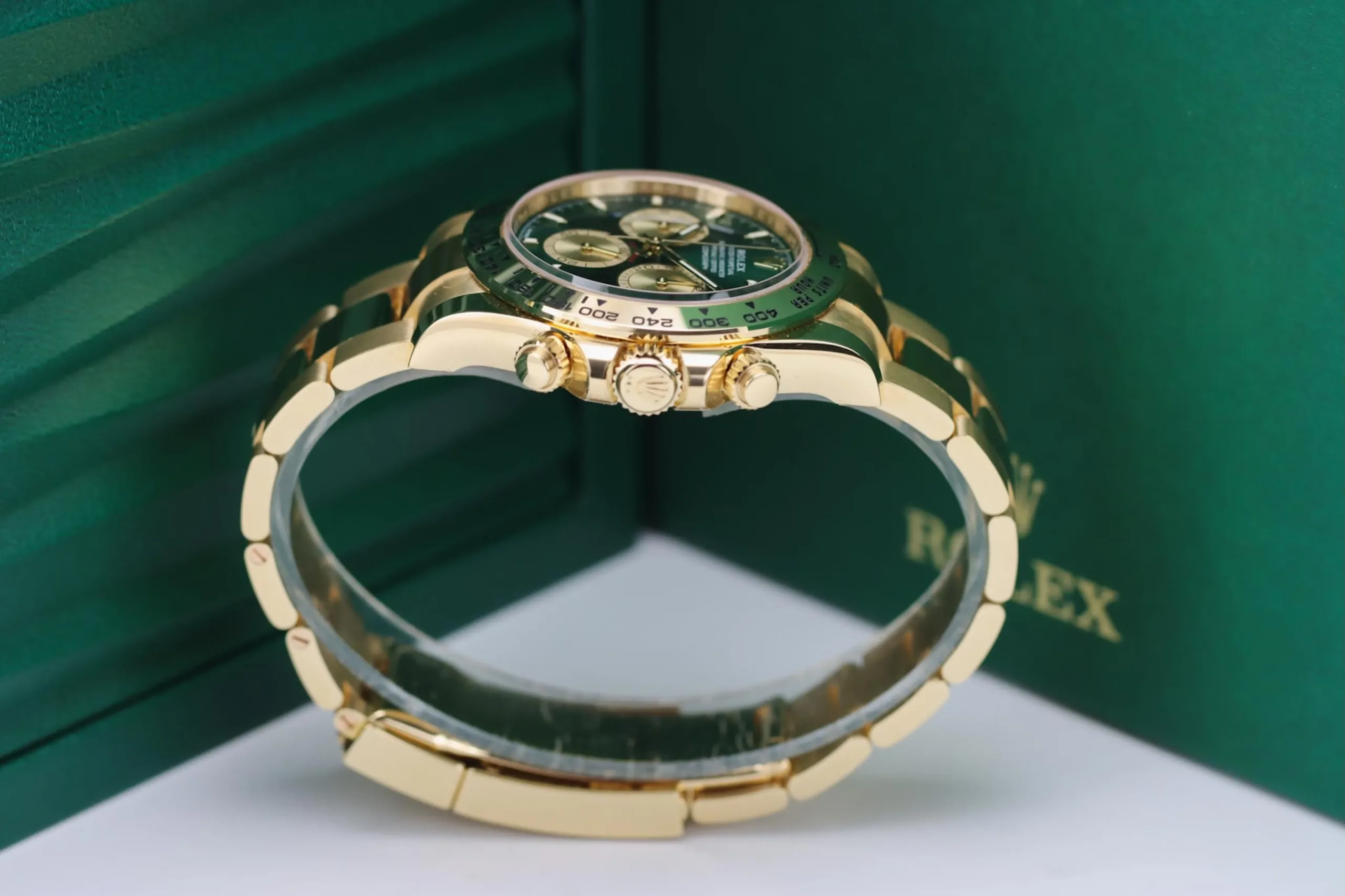 The Rolex Daytona 126508 in yellow gold with the sought-after green “John Mayer” dial is one of the most desirable modern chronographs on the market. This 2025 example remains completely unworn, featuring the striking sunburst green dial paired with a solid 18ct yellow gold case and Oyster bracelet. Known among collectors as the “John Mayer Daytona,” this reference has become a modern icon thanks to its rarity and investment appeal.
