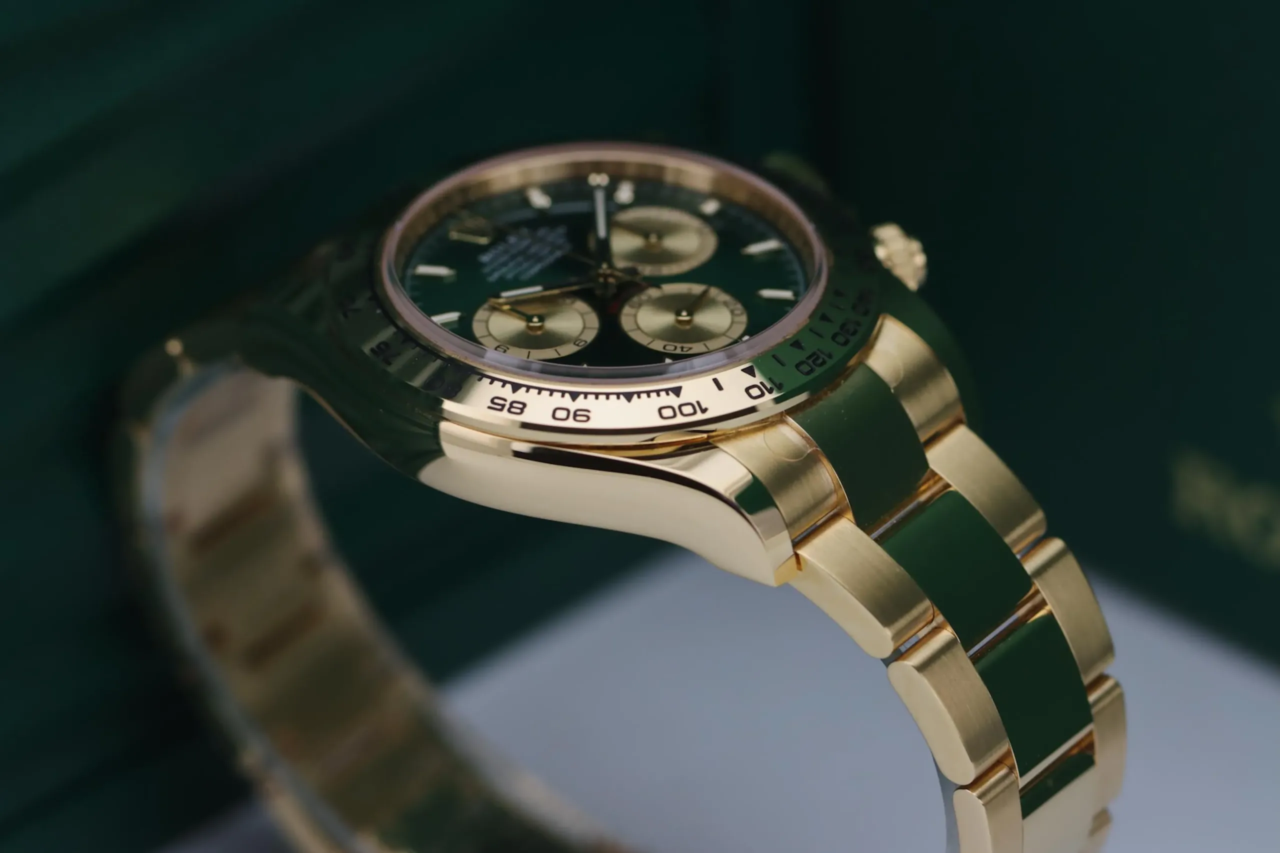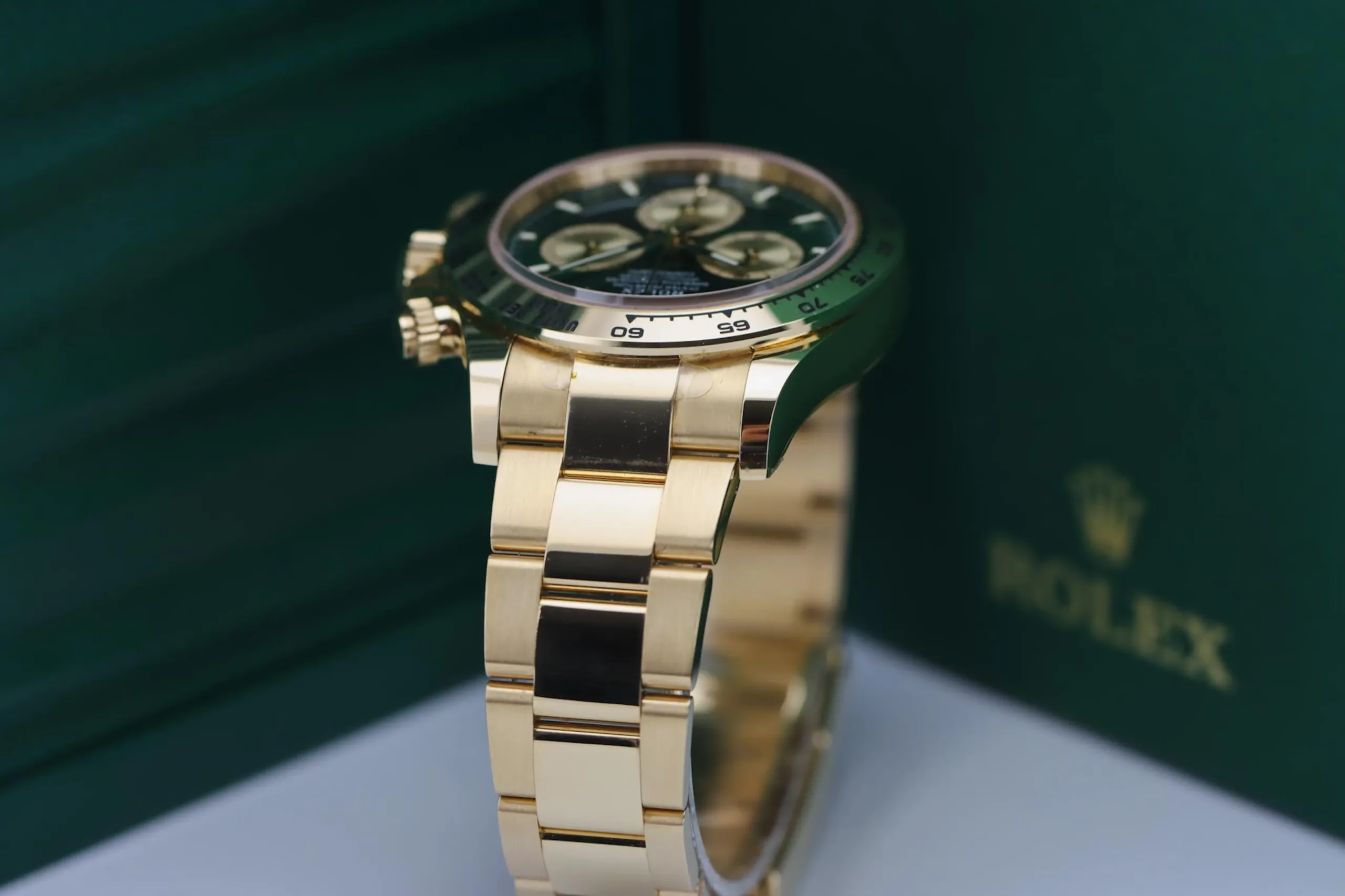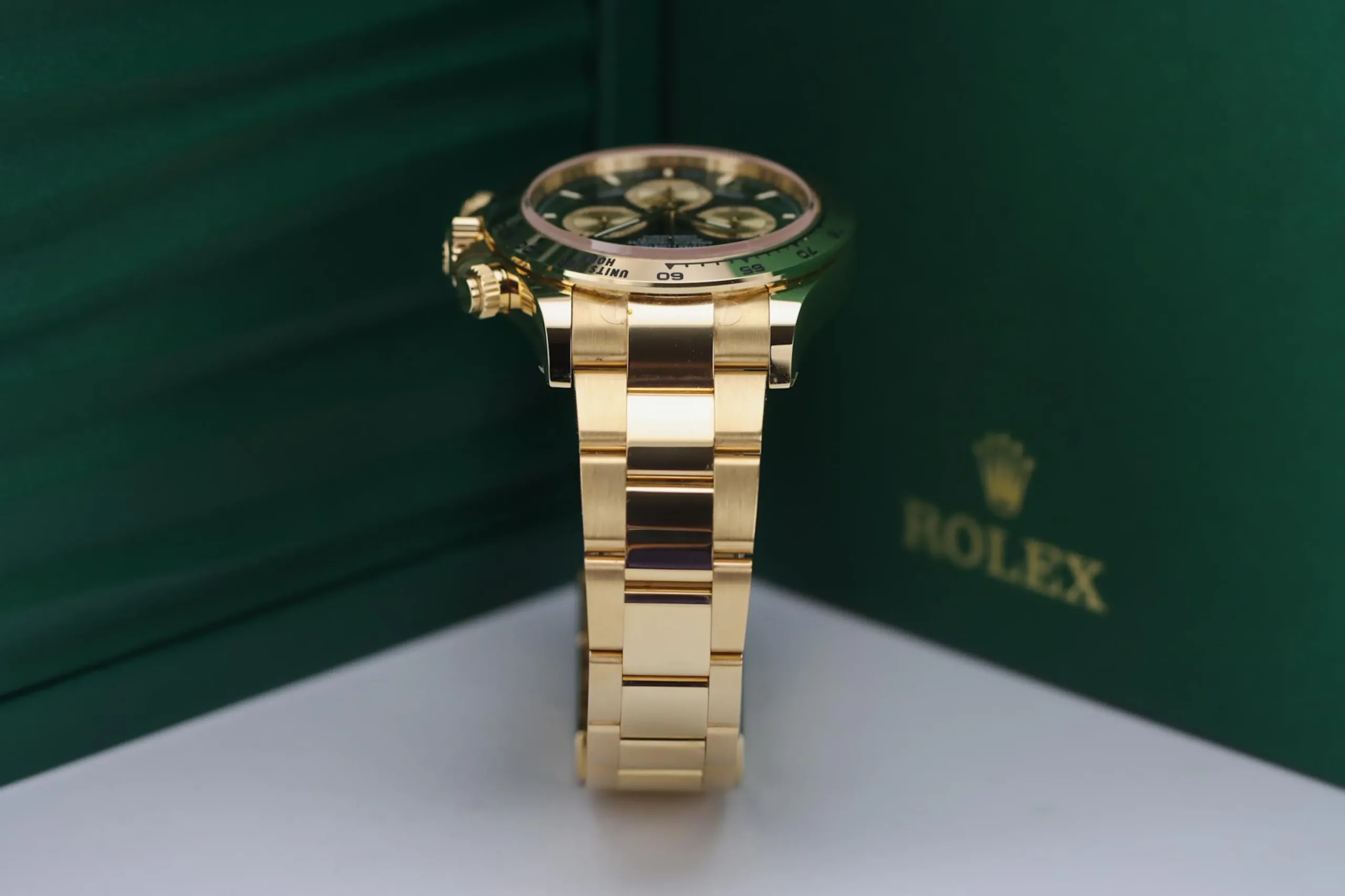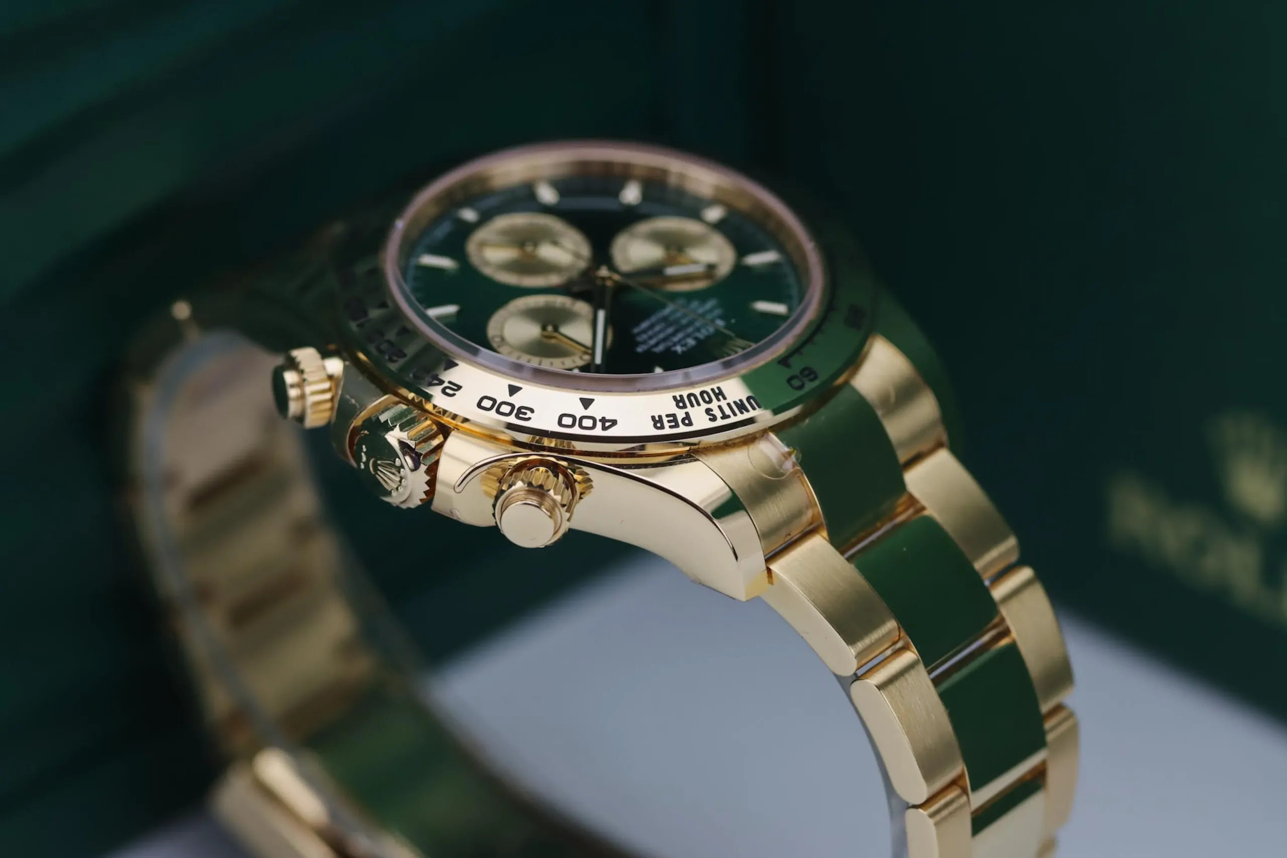 The Rolex Daytona 126508 in yellow gold with the sought-after green “John Mayer” dial is one of the most desirable modern chronographs on the market. This 2025 example remains completely unworn, featuring the striking sunburst green dial paired with a solid 18ct yellow gold case and Oyster bracelet. Known among collectors as the “John Mayer Daytona,” this reference has become a modern icon thanks to its rarity and investment appeal.