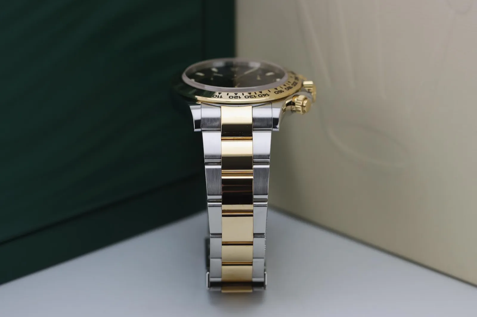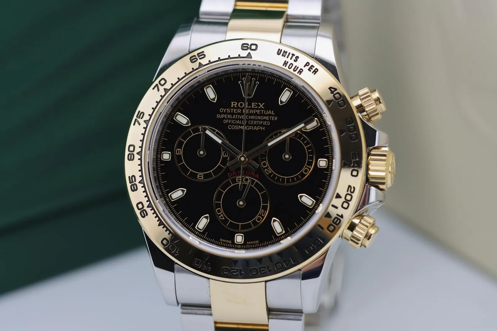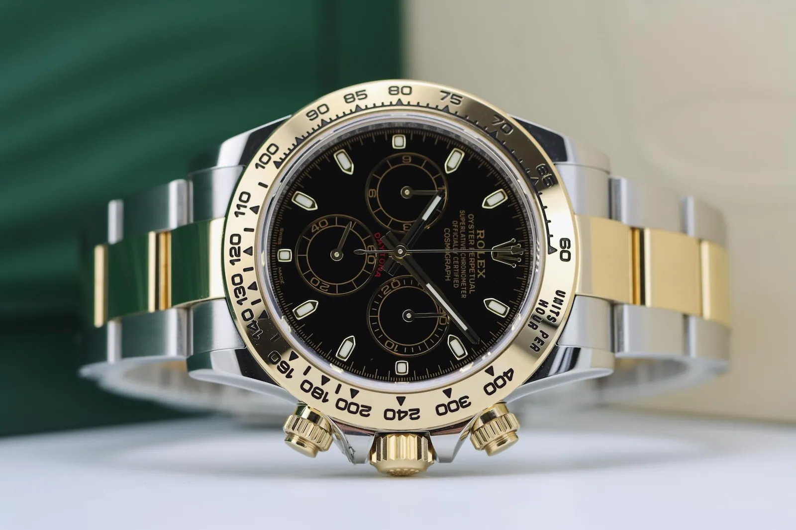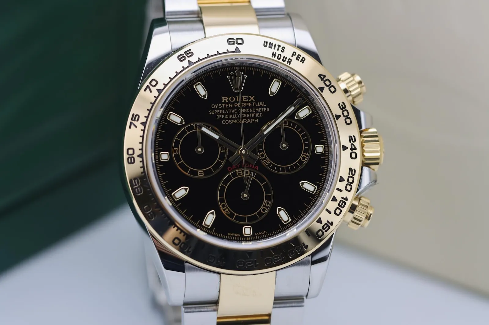 The Rolex Daytona Cosmograph 116503 is a timeless sports chronograph that perfectly blends luxury and performance. Crafted from stainless steel and 18ct yellow gold, this 40mm reference features the elegant black dial with gold sub-dials, offering a striking contrast and signature Daytona aesthetic. Powered by the Rolex calibre 4130 automatic movement, it delivers exceptional precision, reliability, and a 72-hour power reserve.