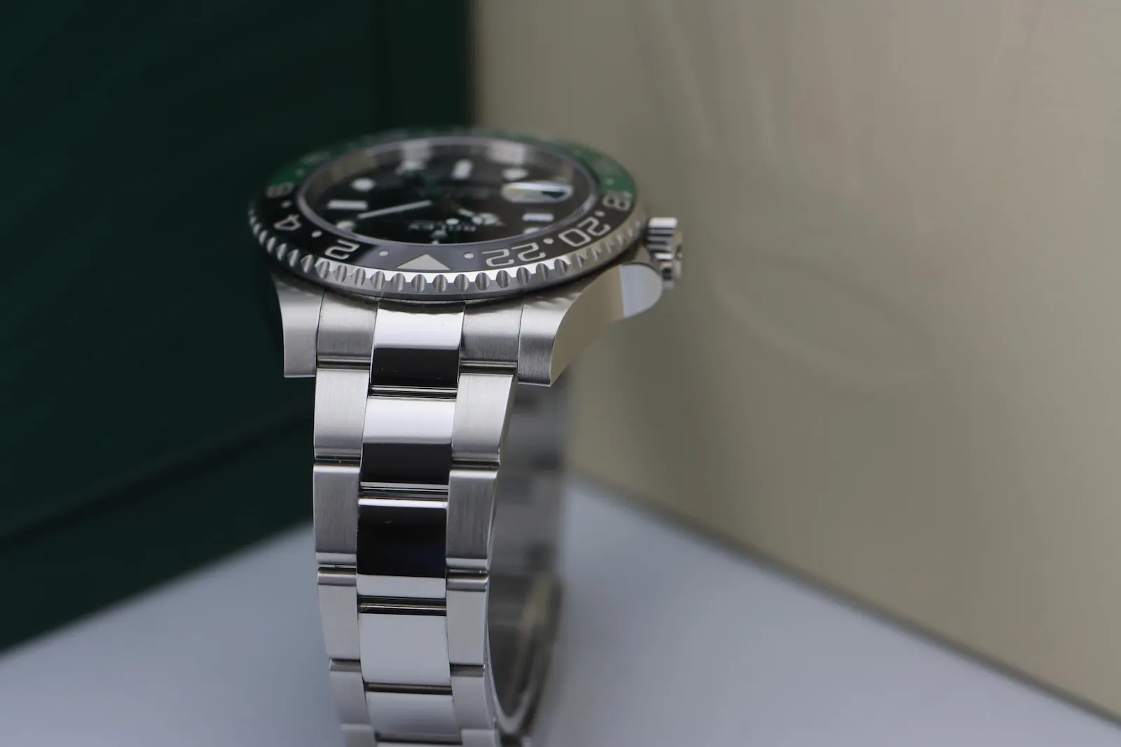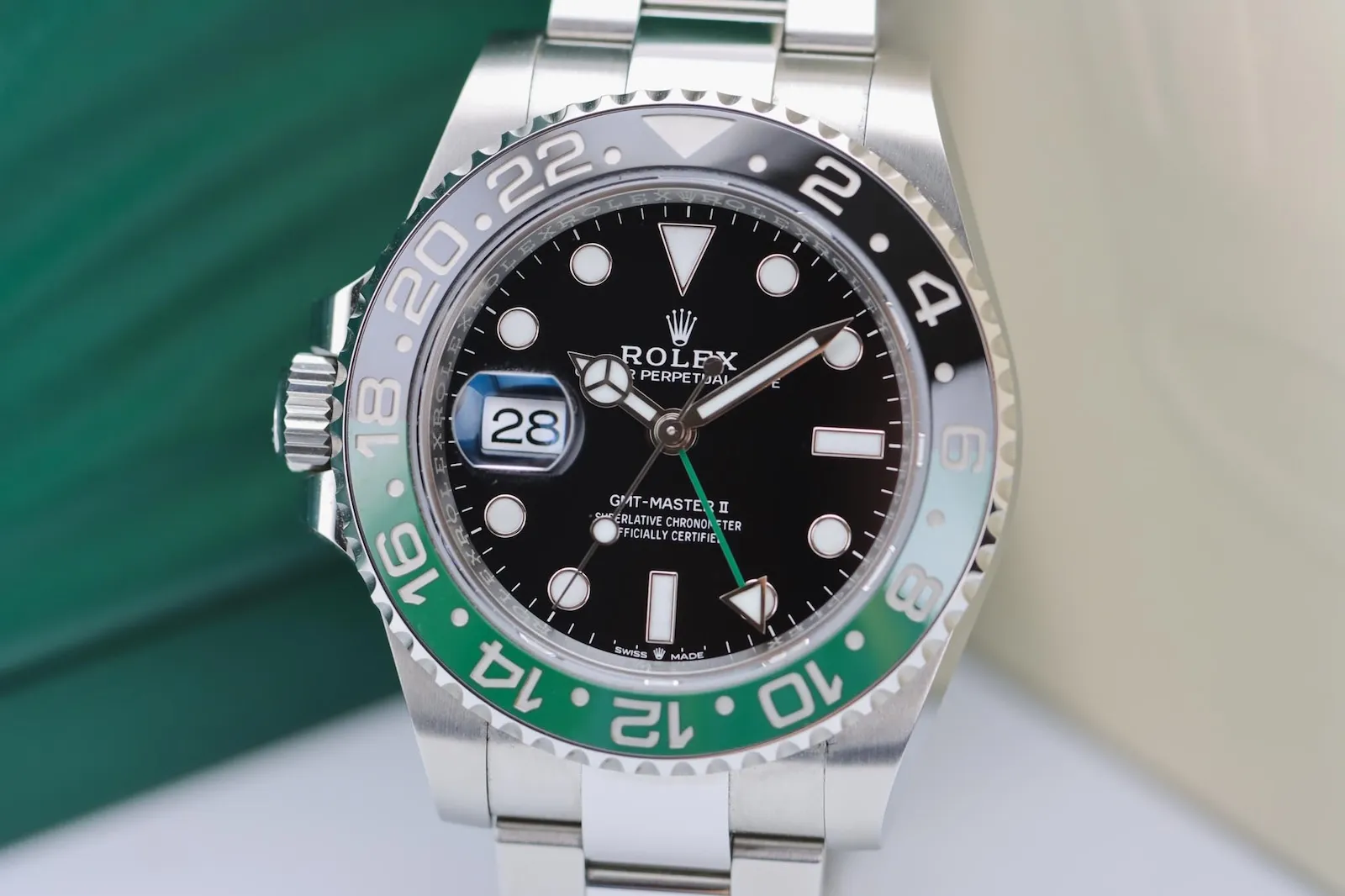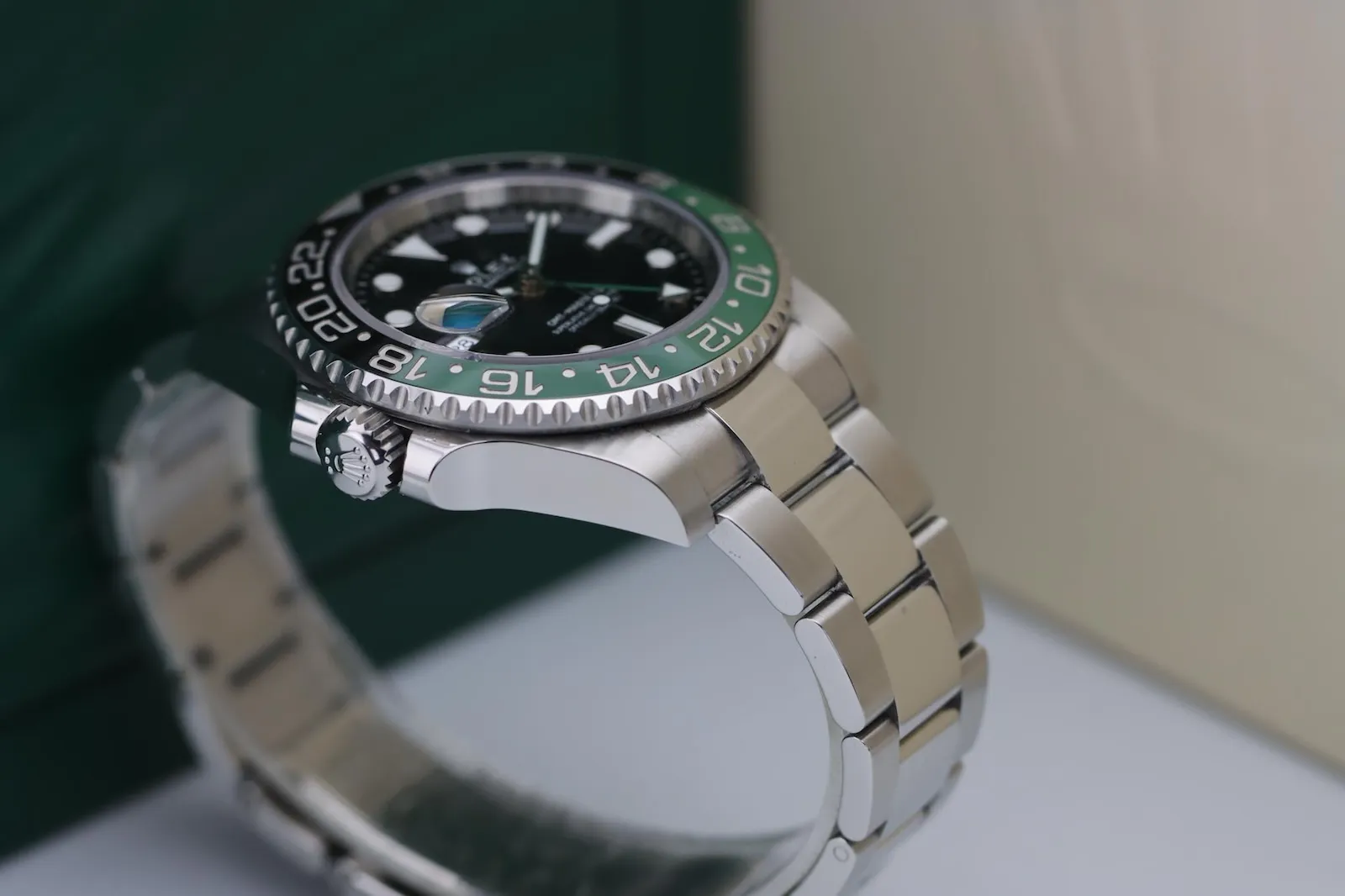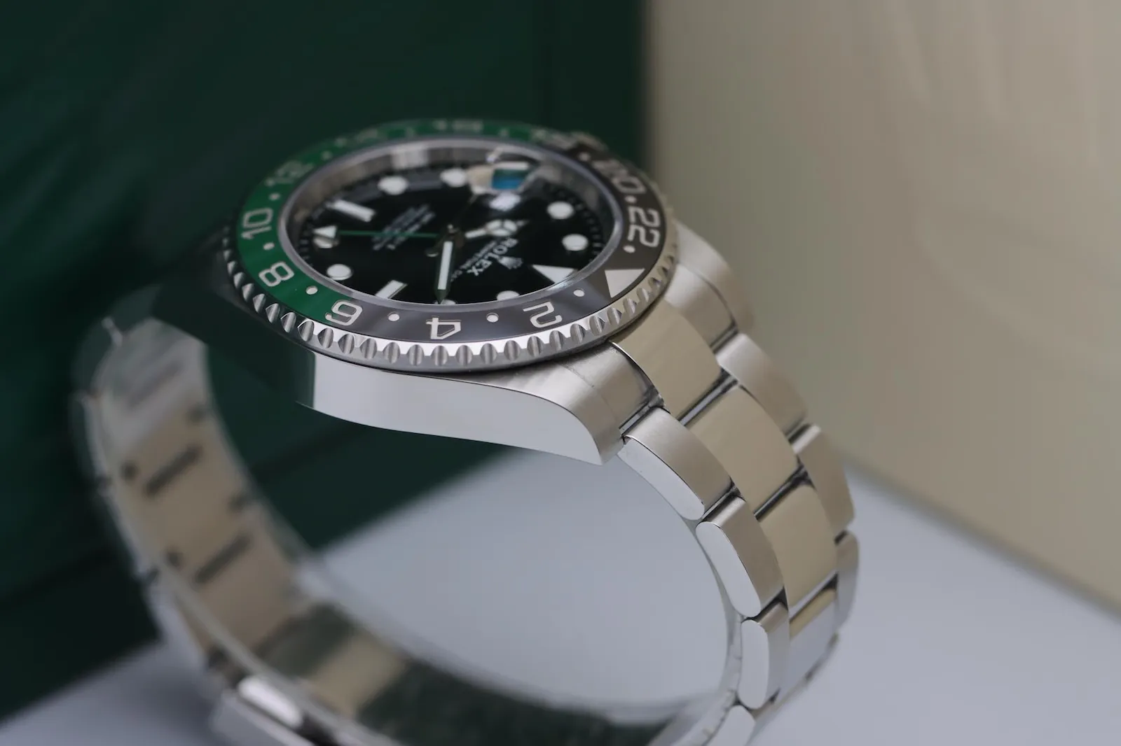 The Rolex GMT-Master II reference 126720VTNR, known as the “Sprite,” is one of the most distinctive and collectible modern Rolex models. It features the striking green and black Cerachrom bezel, black dial, and left-handed crown configuration — the first of its kind in the GMT-Master II line. Crafted in stainless steel and powered by the calibre 3285 automatic movement, it delivers precision, 70-hour power reserve, and dual time zone functionality. This example, dated 2023, is offered as a complete full set with original Rolex box, warranty card, and booklets. In excellent condition and priced at £12,450, this Sprite GMT is a modern icon sought after by collectors for its rarity and unique character.