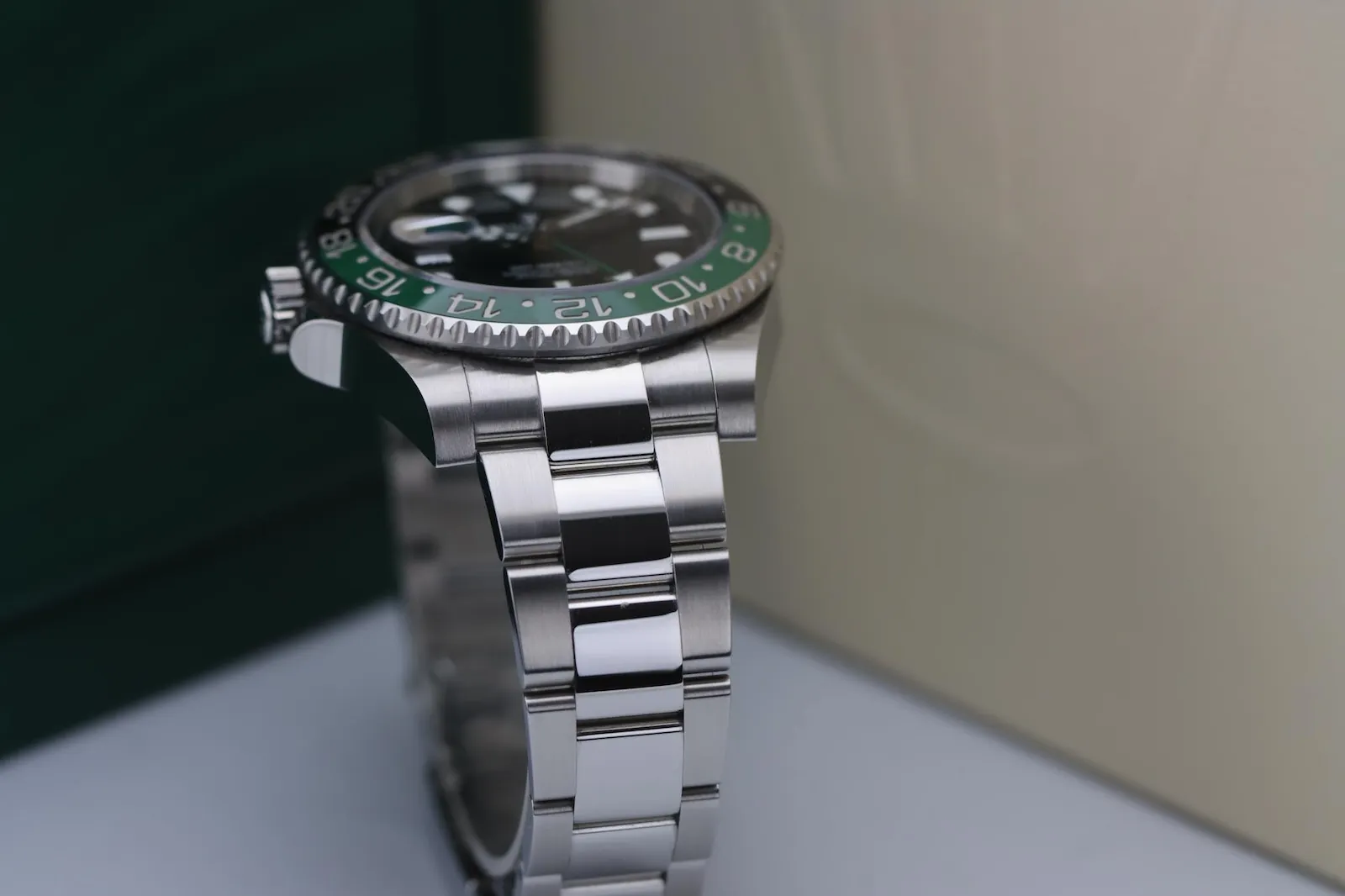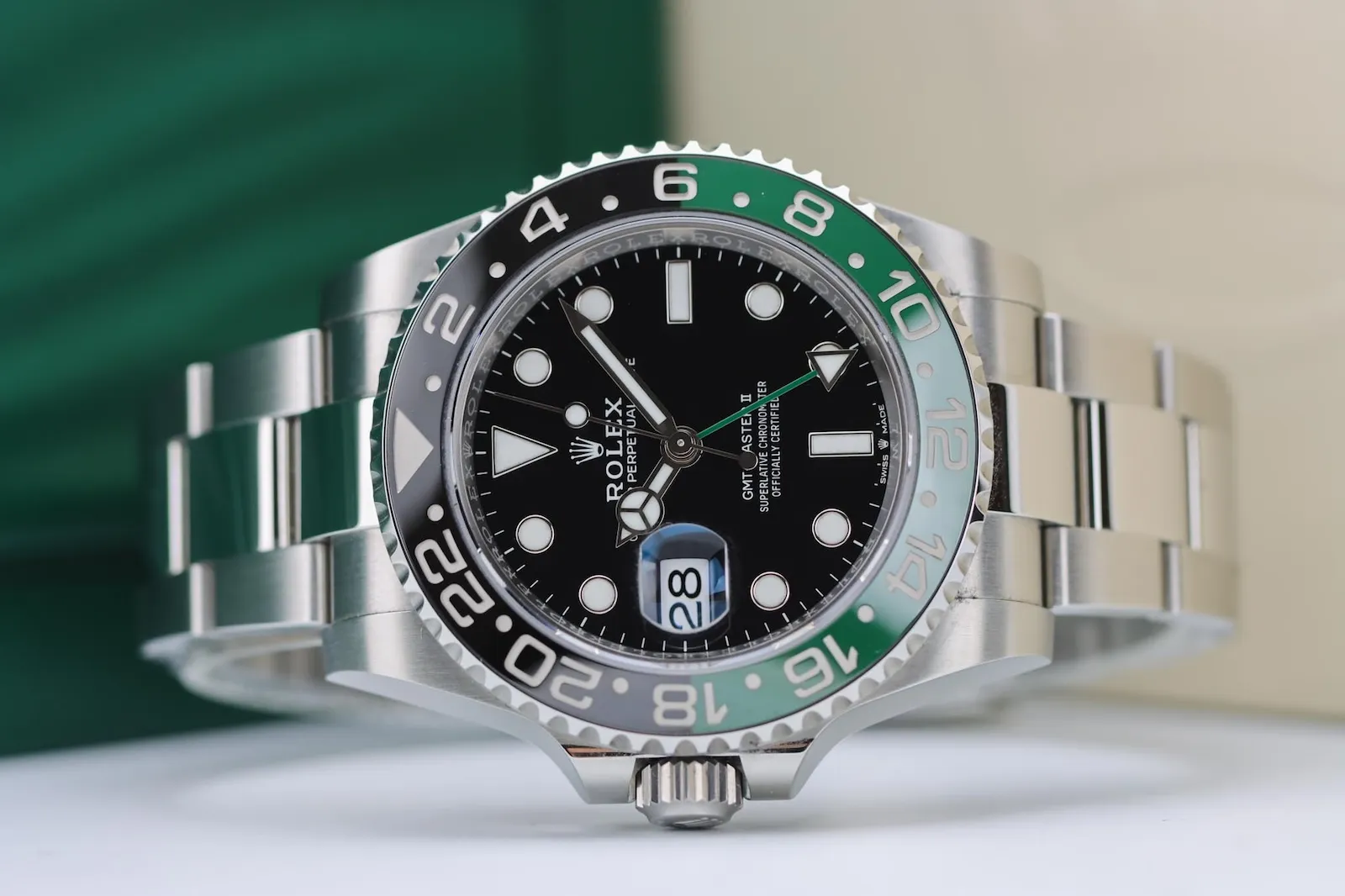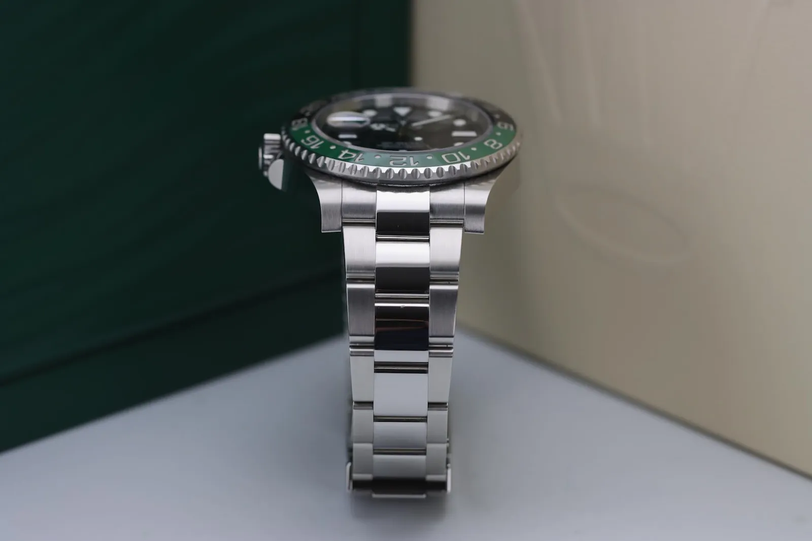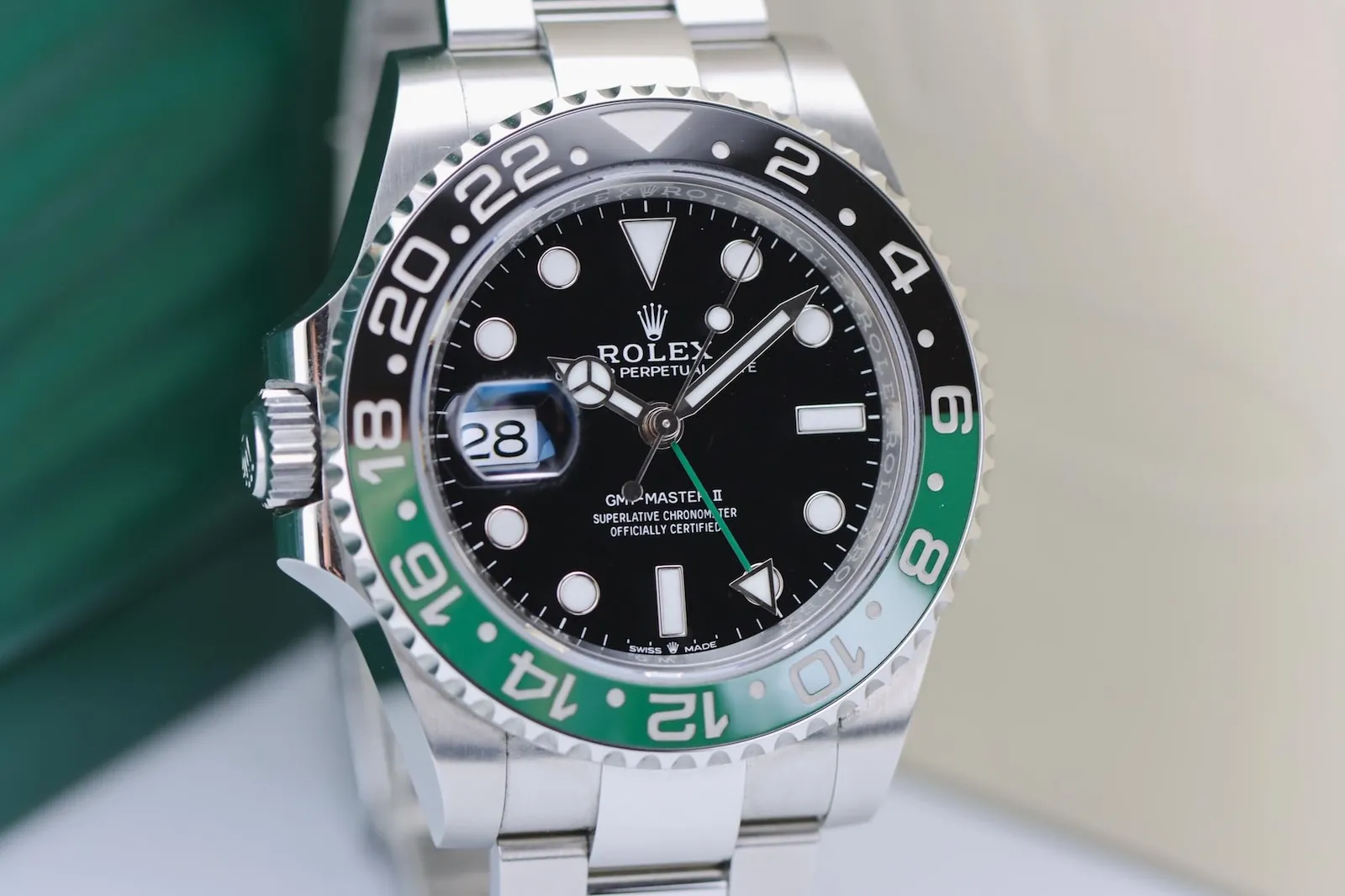 The Rolex GMT-Master II reference 126720VTNR, known as the “Sprite,” is one of the most distinctive and collectible modern Rolex models. It features the striking green and black Cerachrom bezel, black dial, and left-handed crown configuration — the first of its kind in the GMT-Master II line. Crafted in stainless steel and powered by the calibre 3285 automatic movement, it delivers precision, 70-hour power reserve, and dual time zone functionality. This example, dated 2023, is offered as a complete full set with original Rolex box, warranty card, and booklets. In excellent condition and priced at £12,450, this Sprite GMT is a modern icon sought after by collectors for its rarity and unique character.