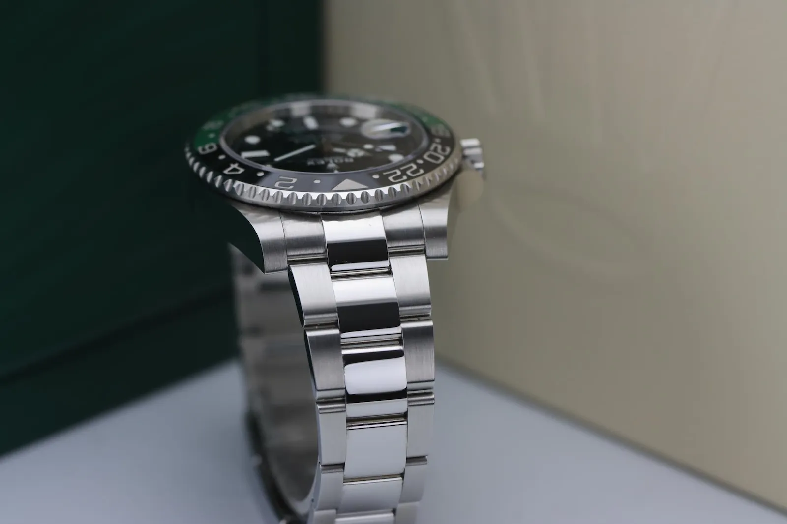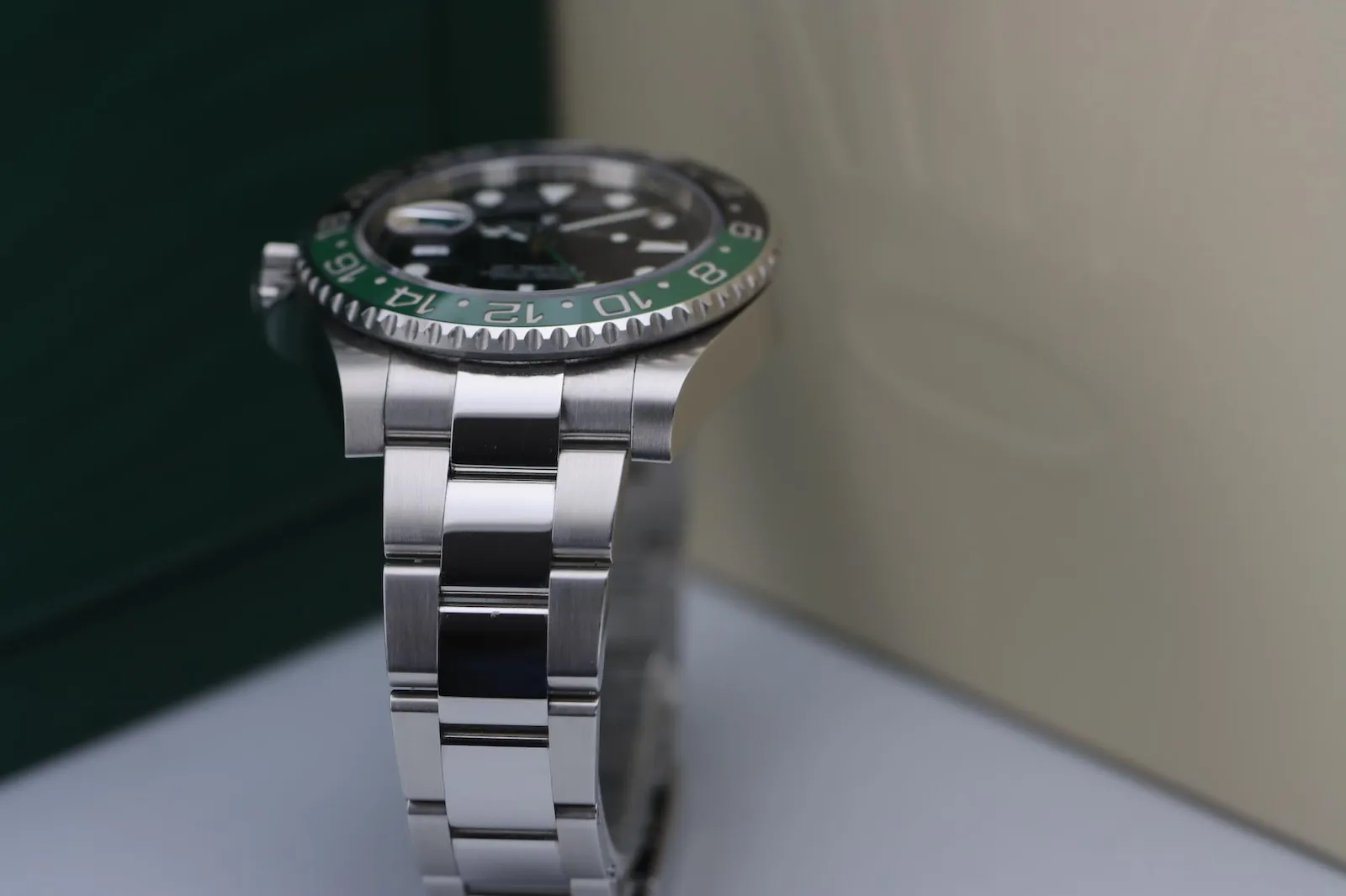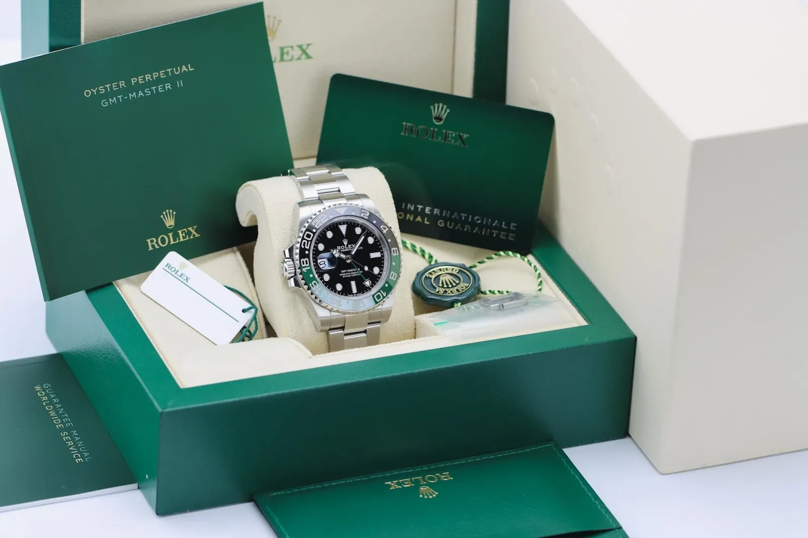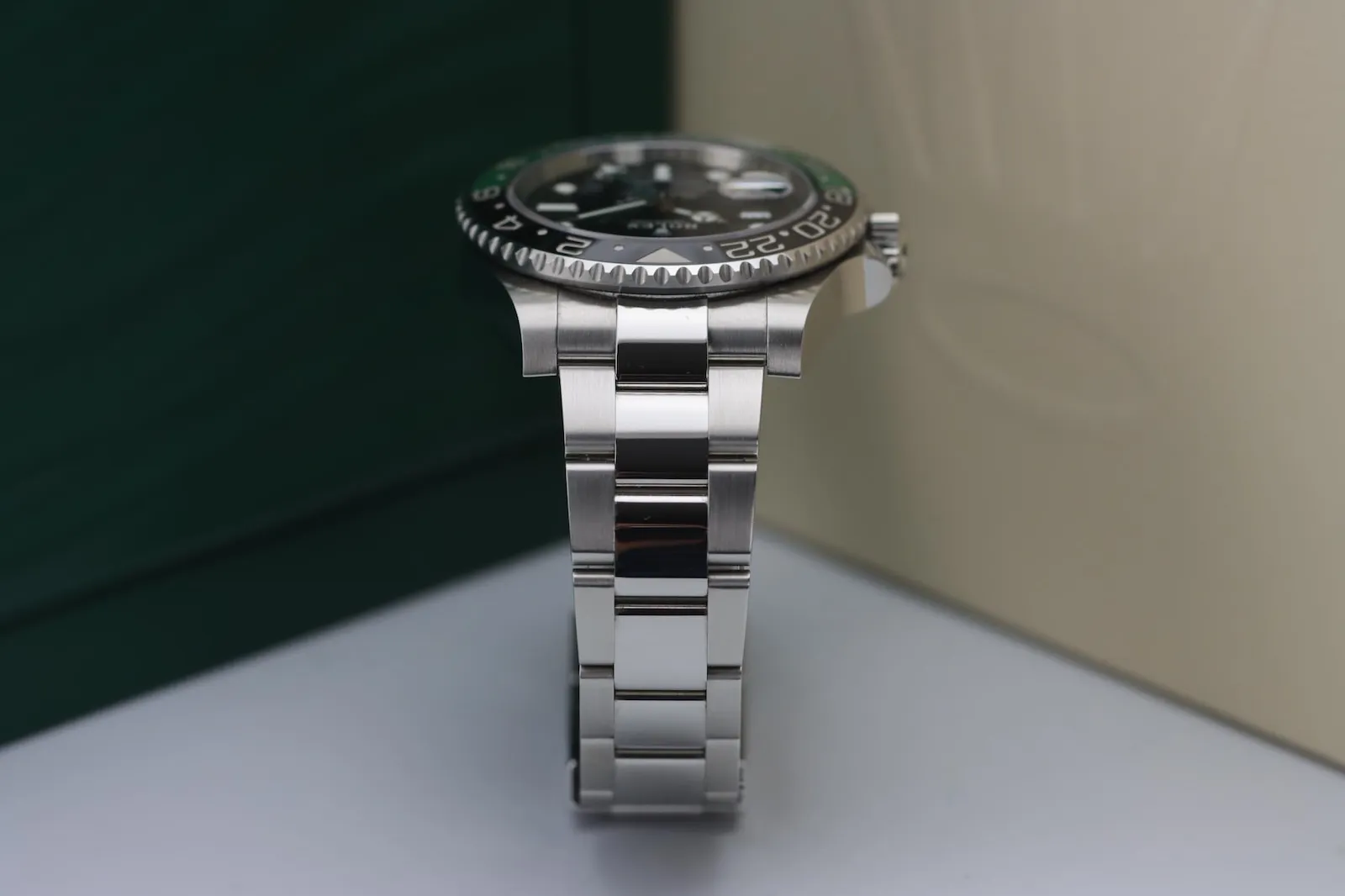 The Rolex GMT-Master II reference 126720VTNR, known as the “Sprite,” is one of the most distinctive and collectible modern Rolex models. It features the striking green and black Cerachrom bezel, black dial, and left-handed crown configuration — the first of its kind in the GMT-Master II line. Crafted in stainless steel and powered by the calibre 3285 automatic movement, it delivers precision, 70-hour power reserve, and dual time zone functionality. This example, dated 2023, is offered as a complete full set with original Rolex box, warranty card, and booklets. In excellent condition and priced at £12,450, this Sprite GMT is a modern icon sought after by collectors for its rarity and unique character.