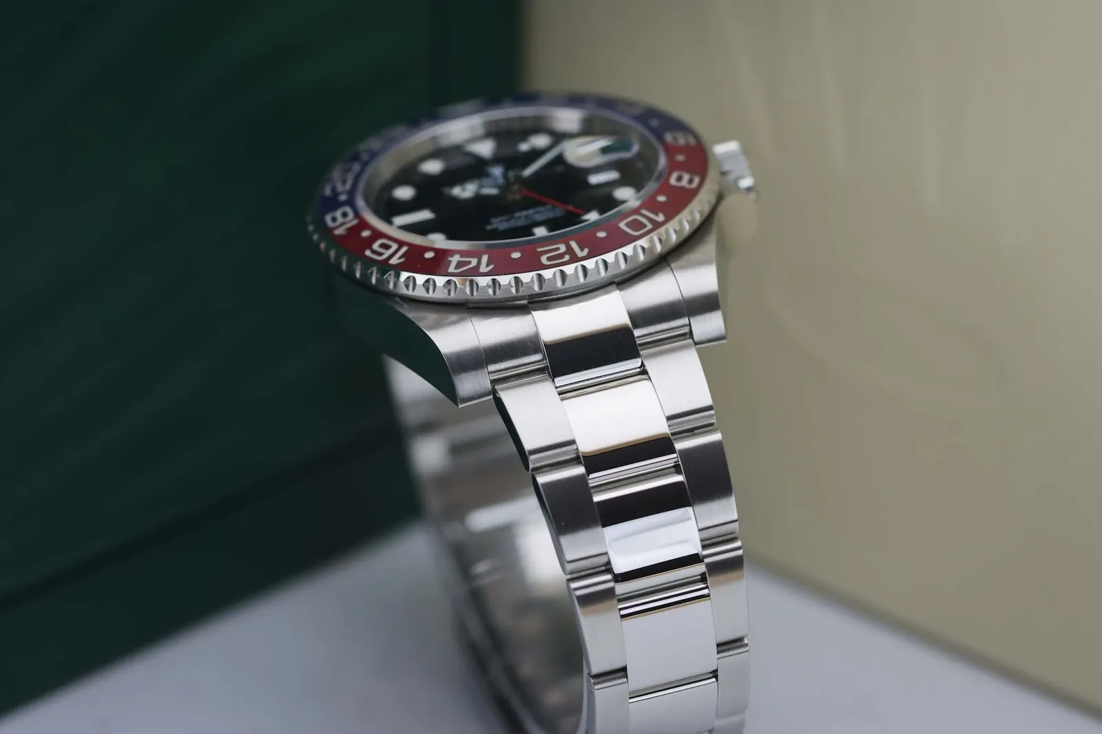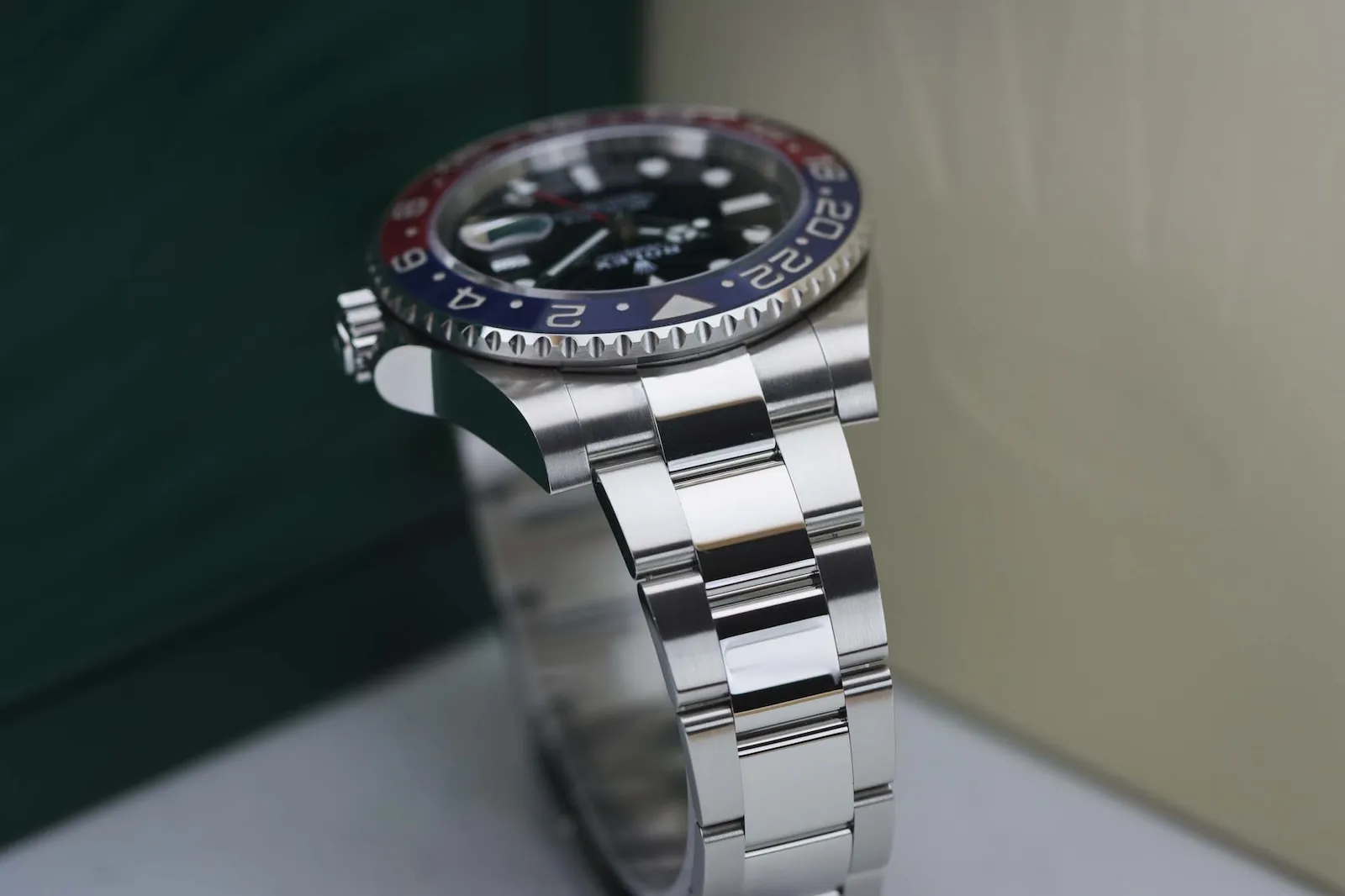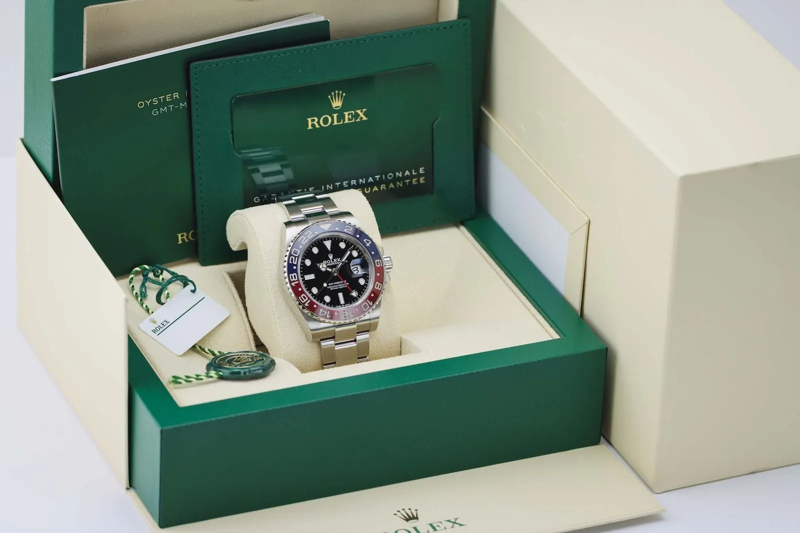 This example, dated 2022, is offered in excellent condition as a complete full set including Rolex box, warranty card, and booklets. With the highly desirable Oyster bracelet configuration, this Pepsi GMT remains one of the most sought-after references in the Rolex professional range.