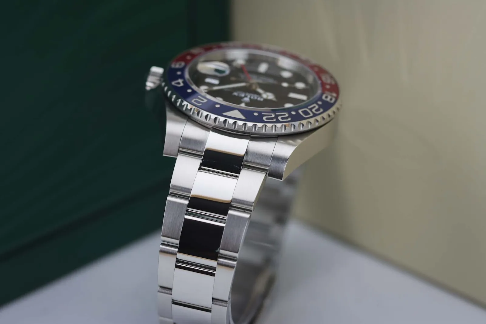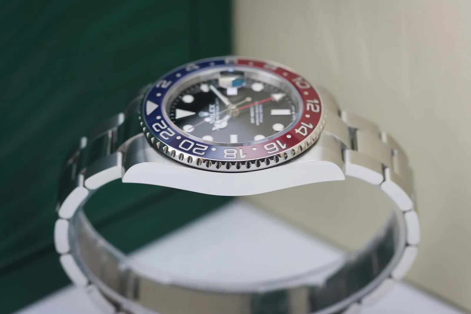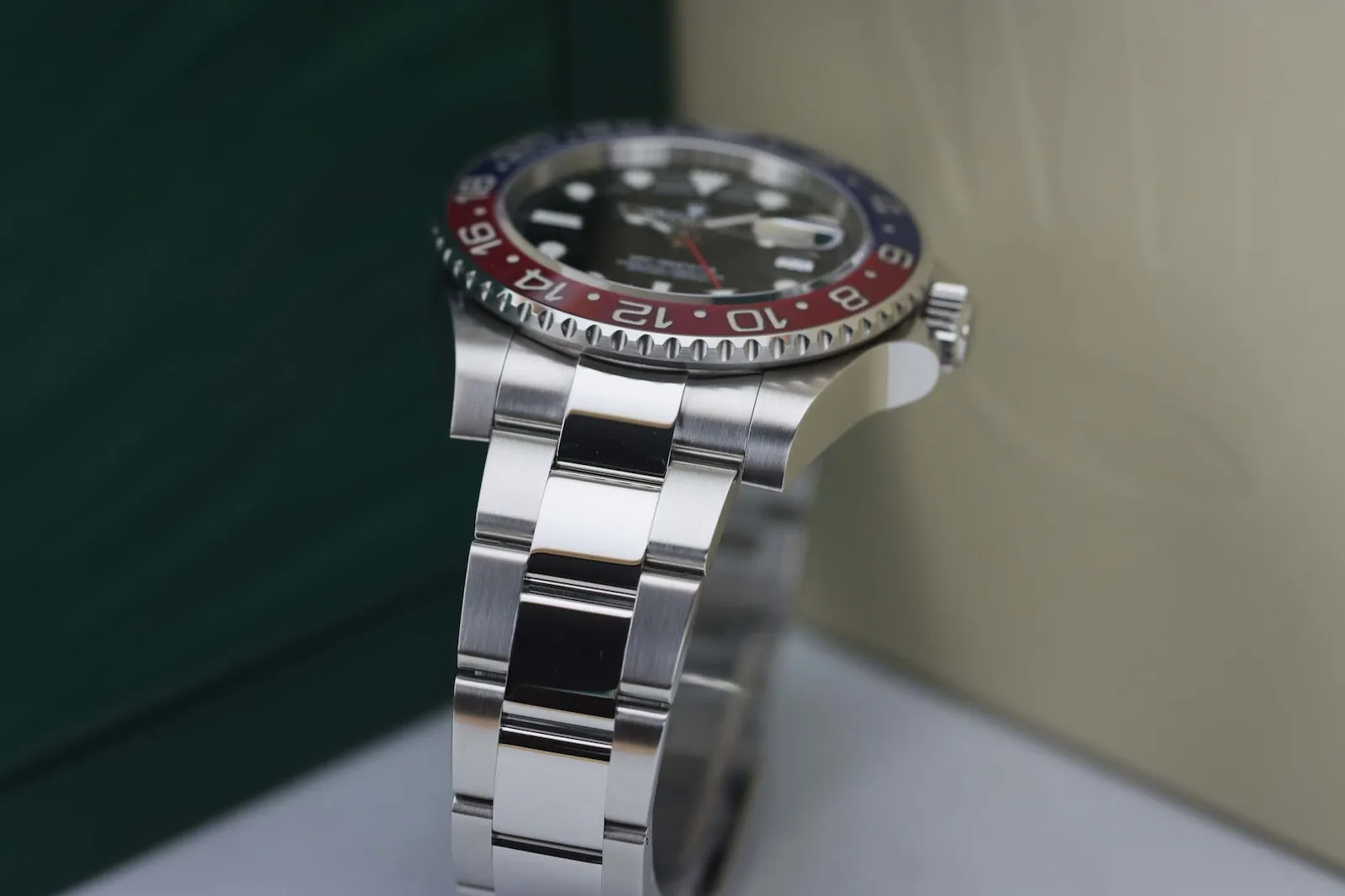 This example, dated 2022, is offered in excellent condition as a complete full set including Rolex box, warranty card, and booklets. With the highly desirable Oyster bracelet configuration, this Pepsi GMT remains one of the most sought-after references in the Rolex professional range.