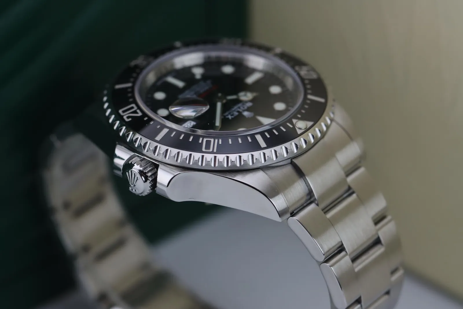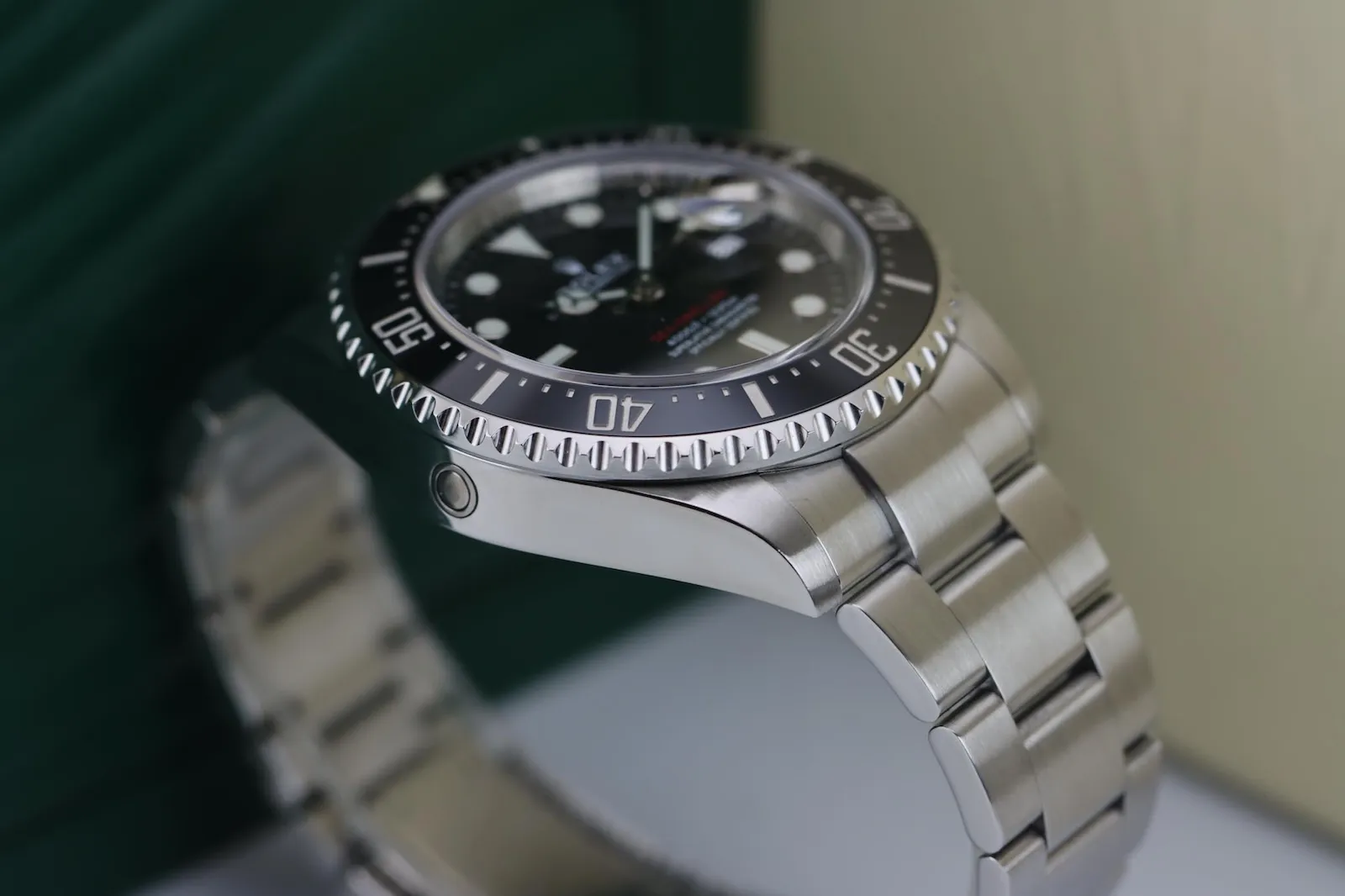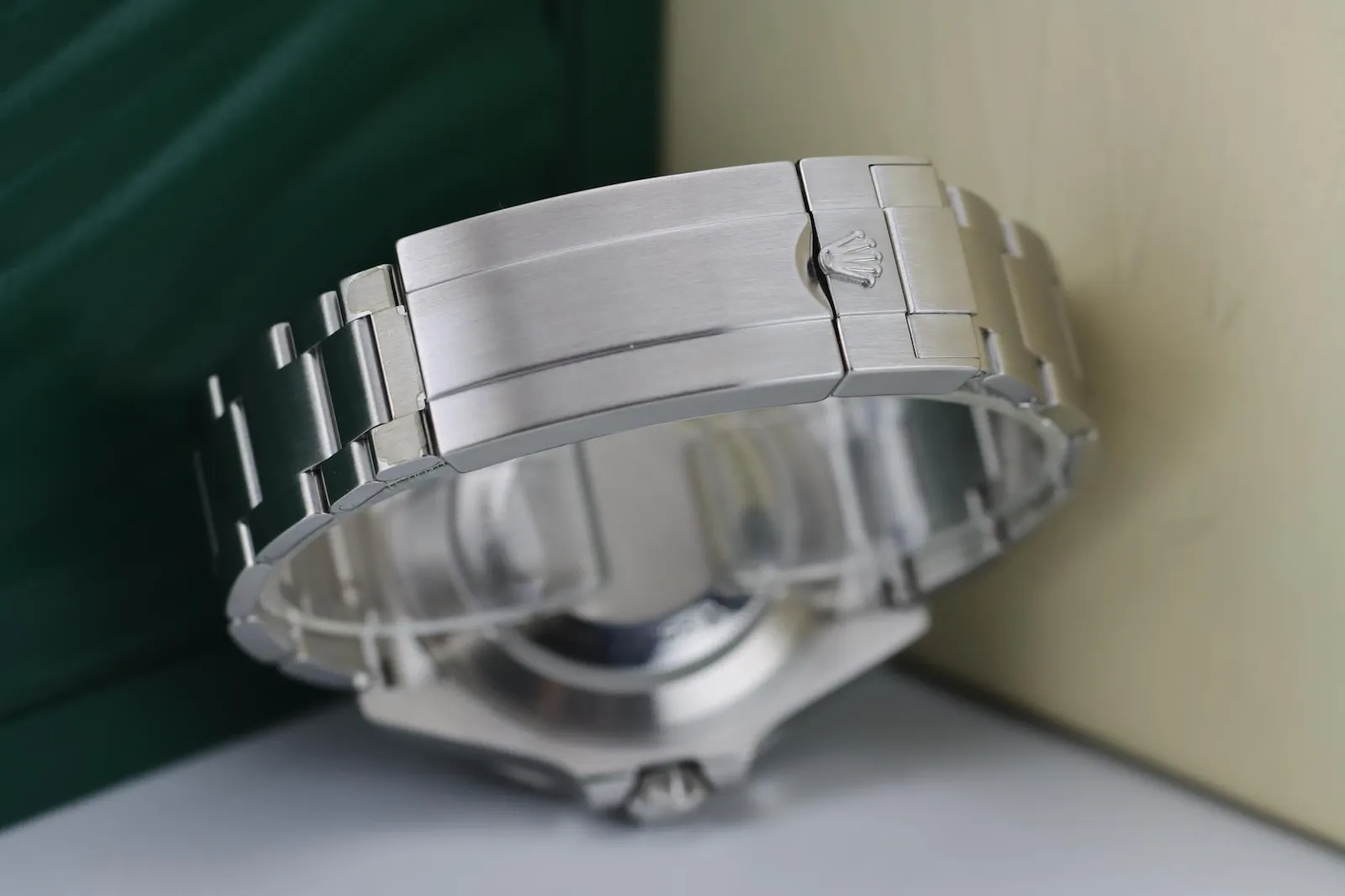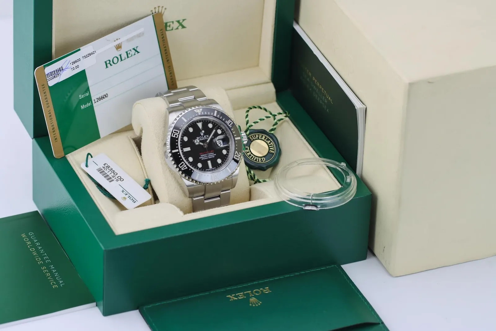 The Rolex Sea-Dweller 126600, introduced to celebrate the model’s 50th anniversary, is one of the most capable professional dive watches in the Rolex lineup. Featuring a robust 43mm stainless steel case, black Cerachrom bezel, and red “Sea-Dweller” text on the dial, it pays tribute to the original design while incorporating modern Rolex innovation. Powered by the calibre 3235 automatic movement, it offers a 70-hour power reserve and water resistance up to 1,220 metres (4,000ft).