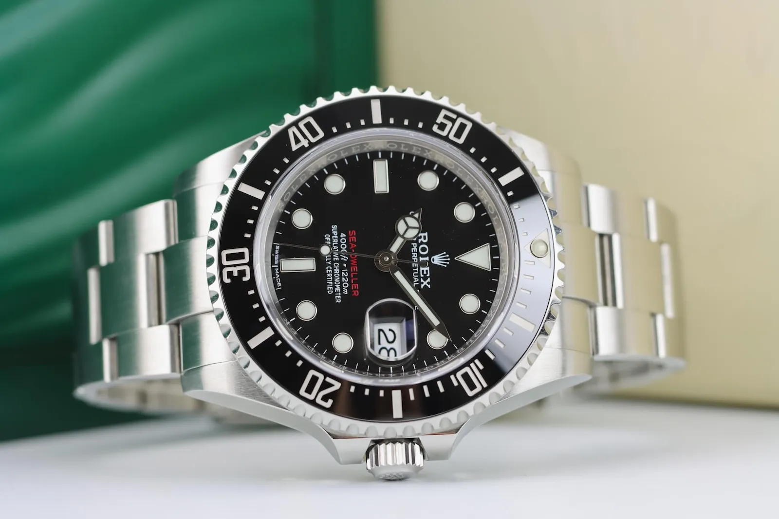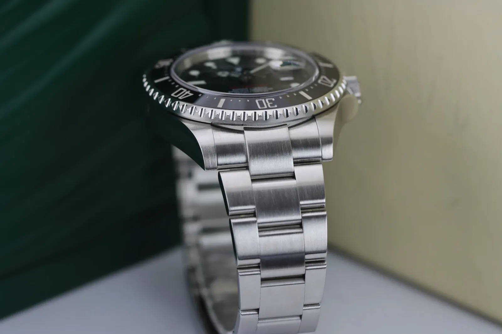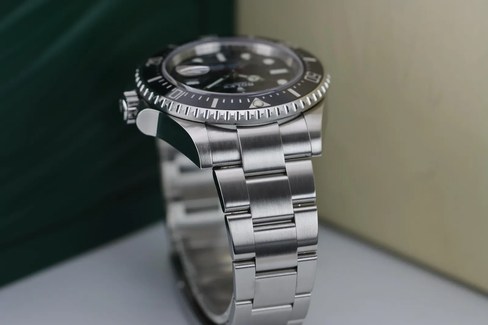 The Rolex Sea-Dweller 126600, introduced to celebrate the model’s 50th anniversary, is one of the most capable professional dive watches in the Rolex lineup. Featuring a robust 43mm stainless steel case, black Cerachrom bezel, and red “Sea-Dweller” text on the dial, it pays tribute to the original design while incorporating modern Rolex innovation. Powered by the calibre 3235 automatic movement, it offers a 70-hour power reserve and water resistance up to 1,220 metres (4,000ft).