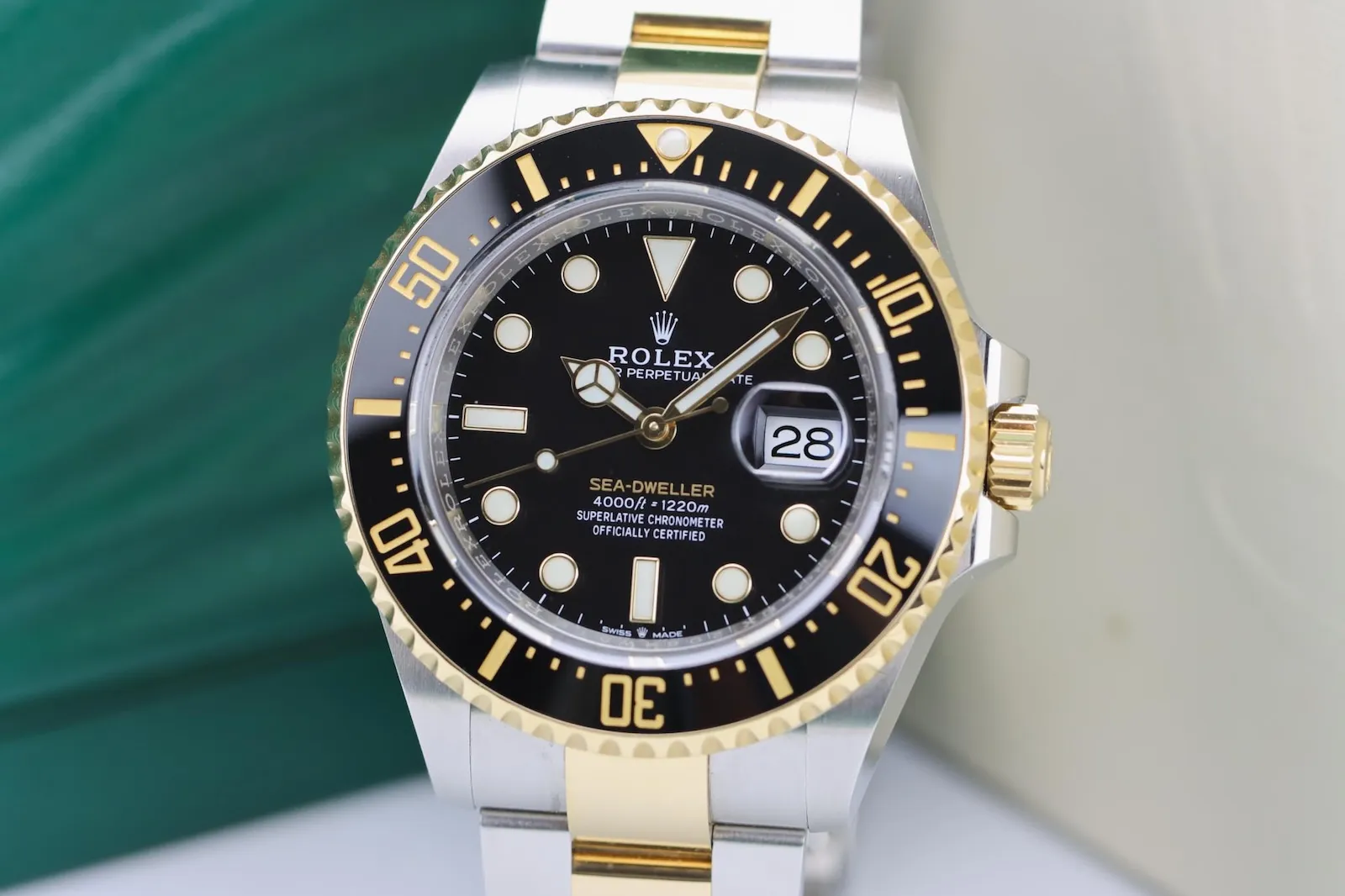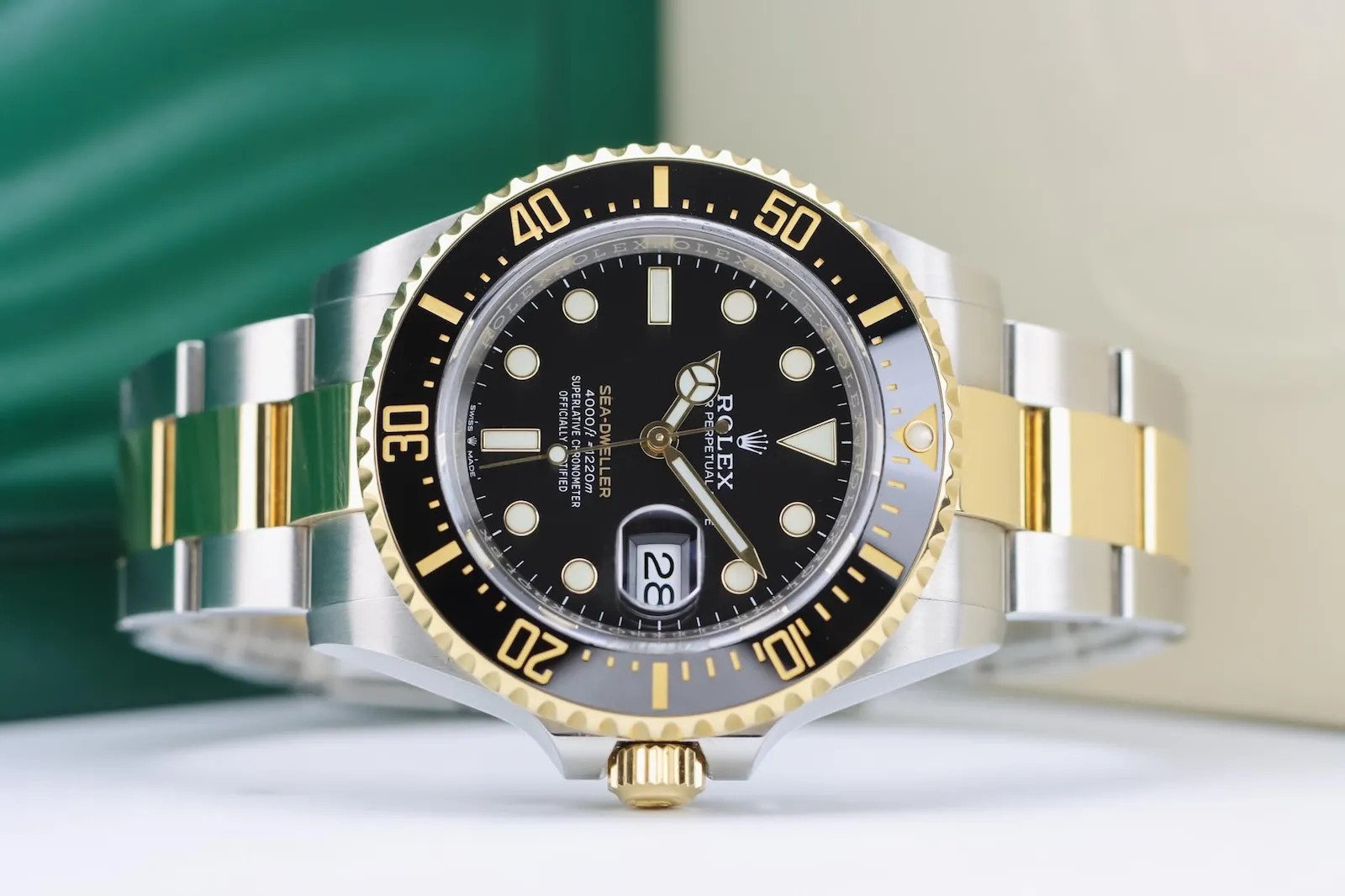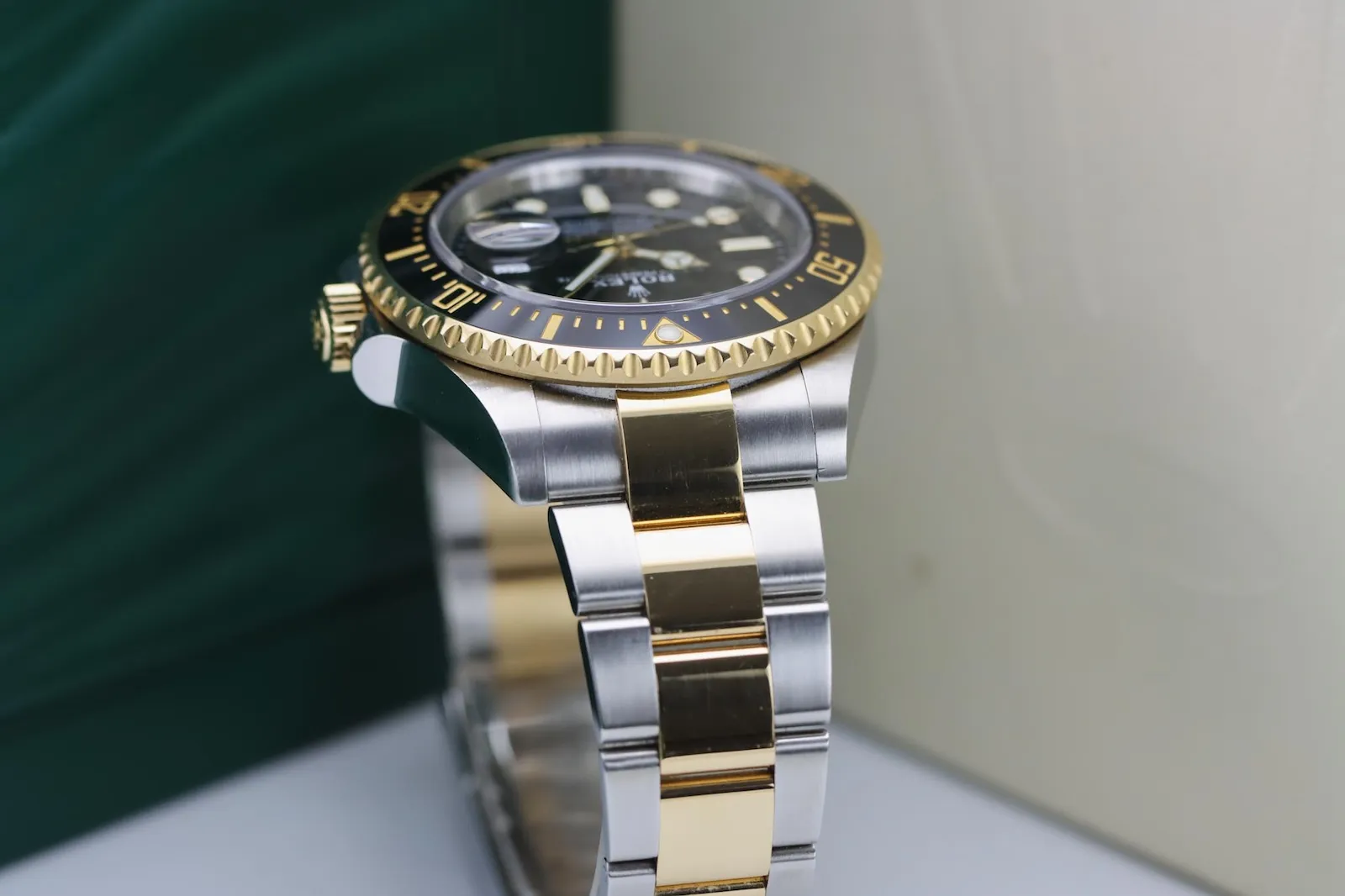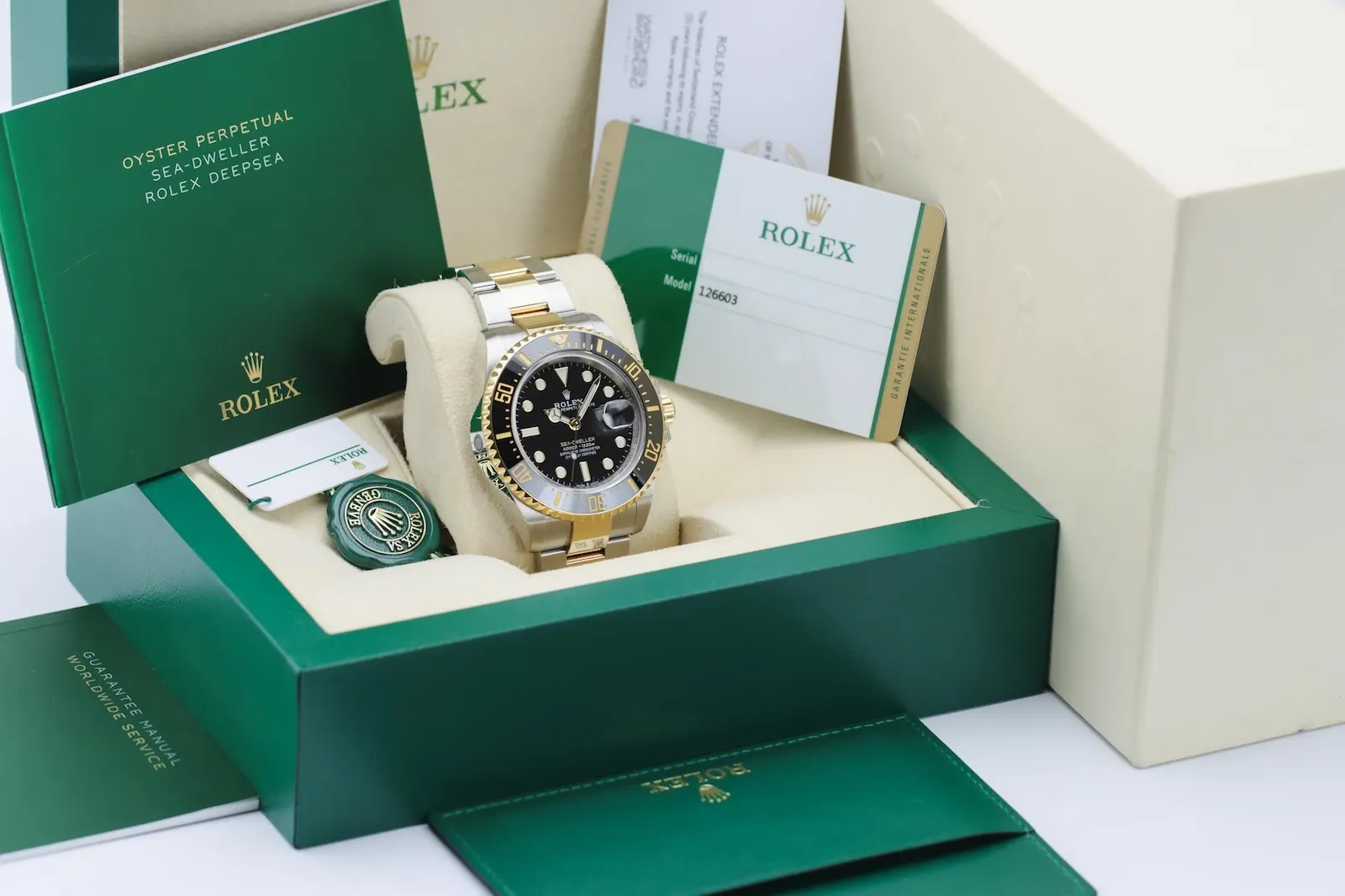 The Rolex Sea-Dweller 126603 is the ultimate tool watch, blending professional diving capability with luxury design. Crafted in robust Oystersteel and 18ct yellow gold, this bi-metal Sea-Dweller offers a commanding 43mm case with a black Cerachrom bezel, designed for durability and underwater legibility.