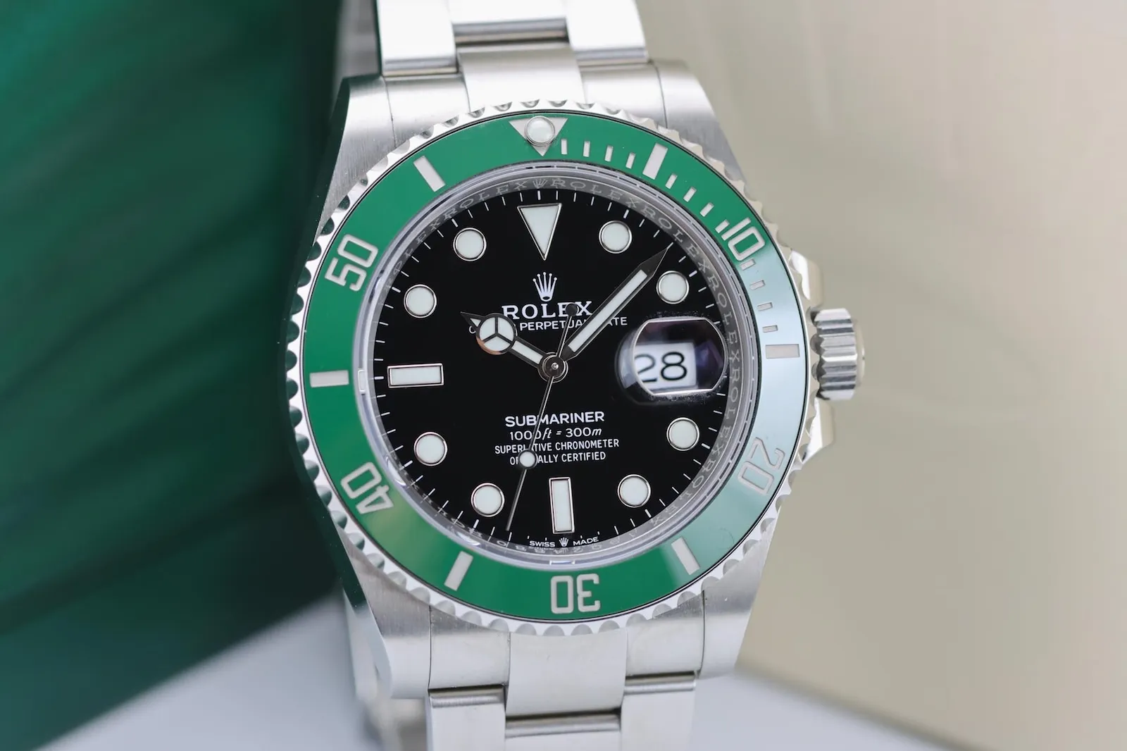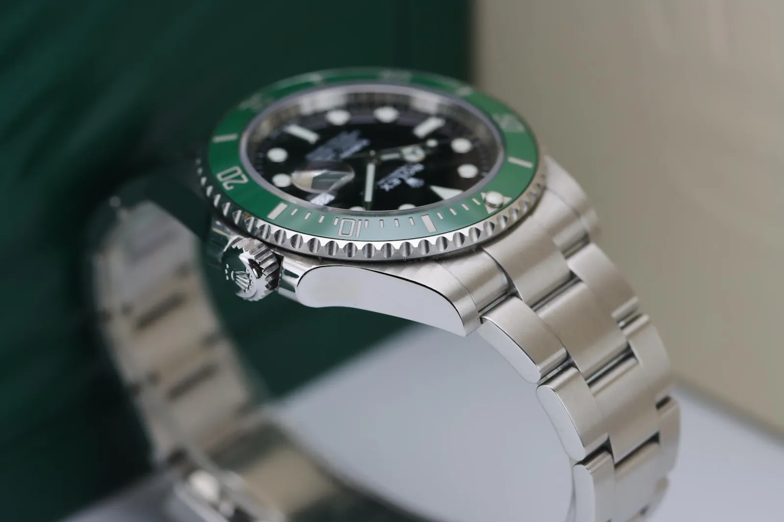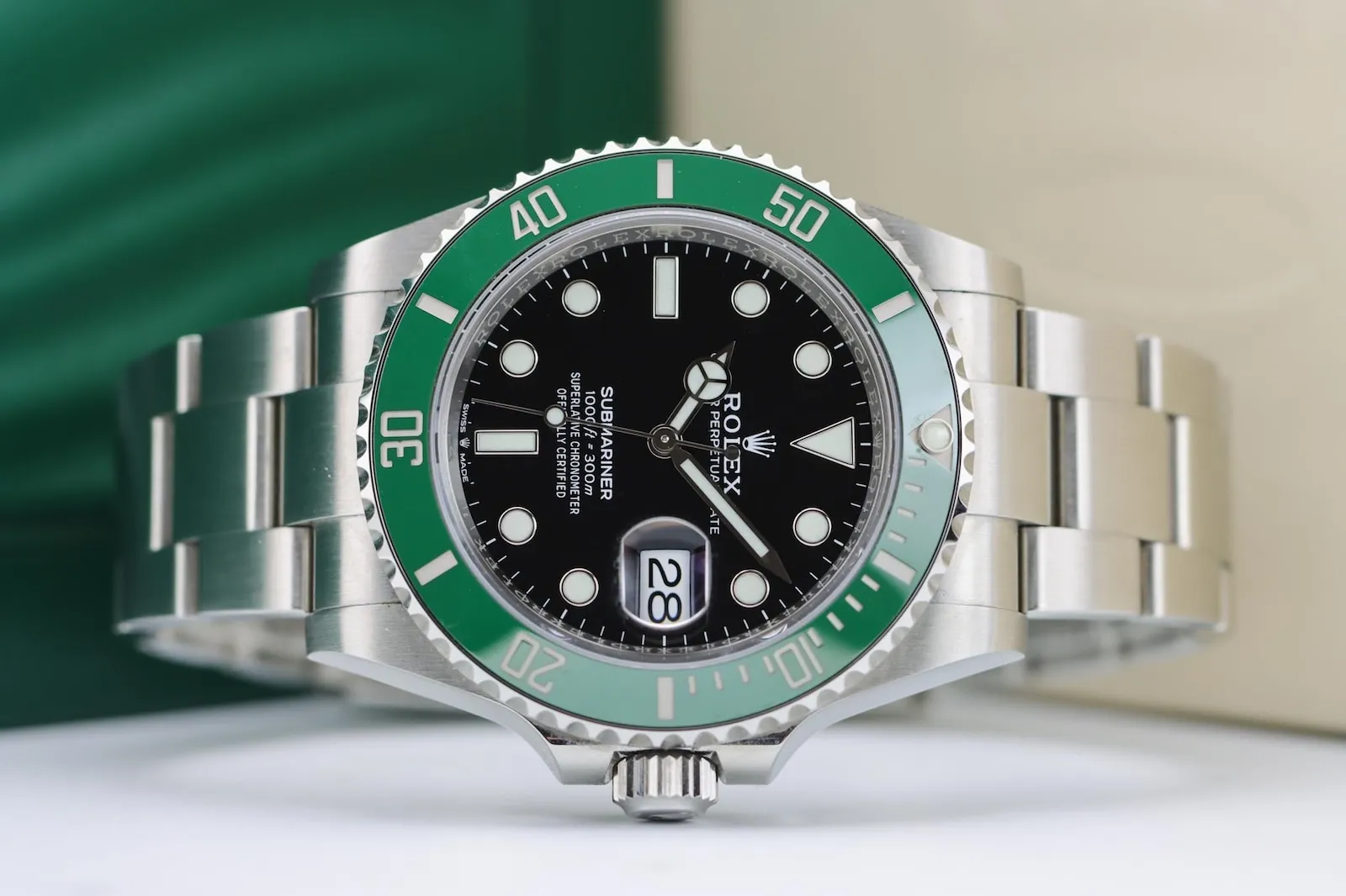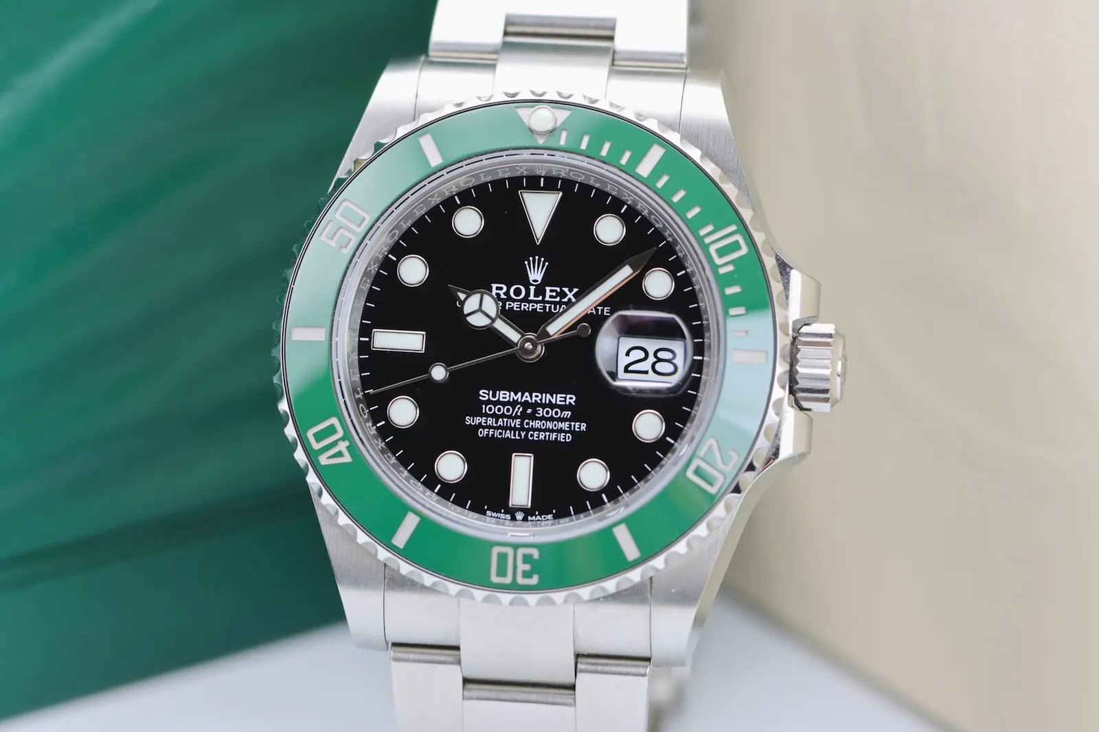 The Rolex Submariner Date 126610LV, nicknamed the “Starbucks,” is one of the most coveted modern Submariners. Featuring a striking black dial and green Cerachrom bezel insert, it pays homage to the legendary “Kermit” while bringing a refreshed 41mm Oystersteel case and updated proportions.
