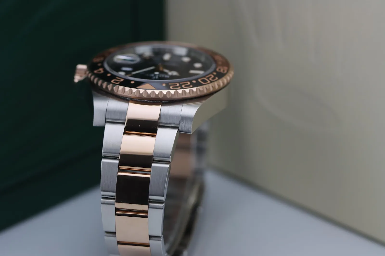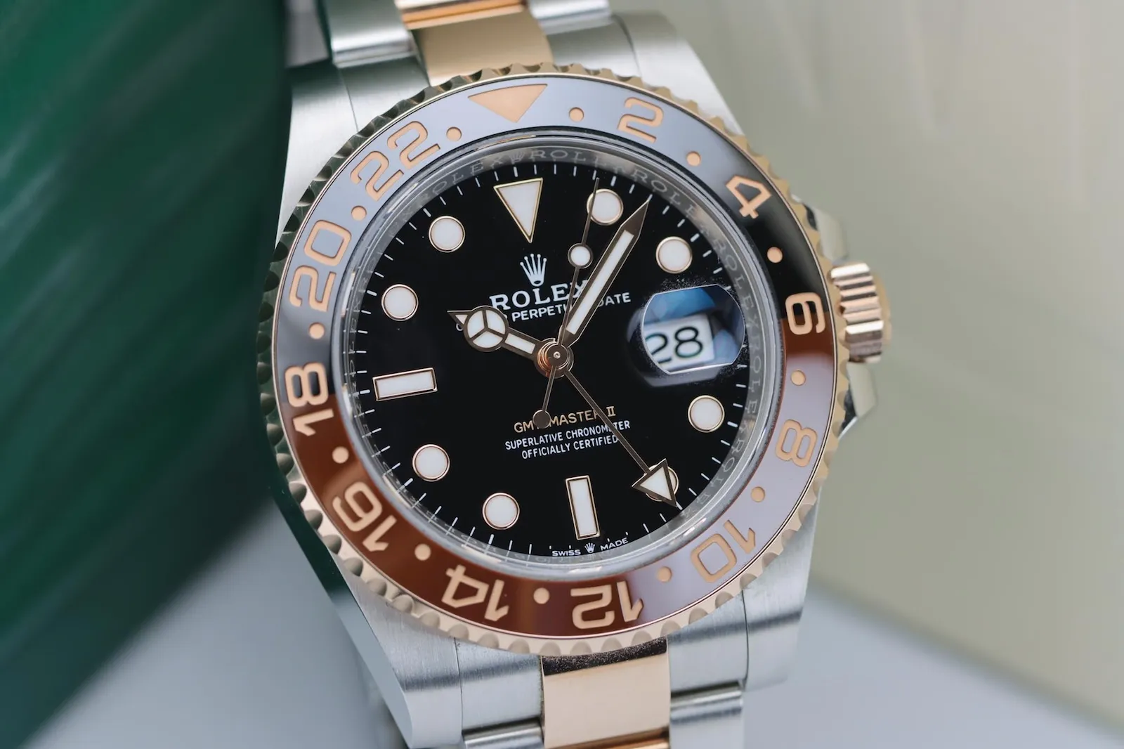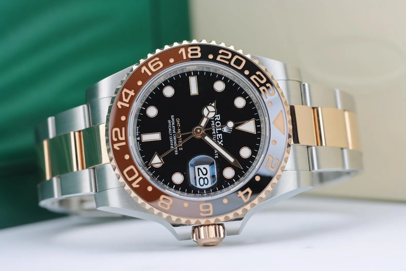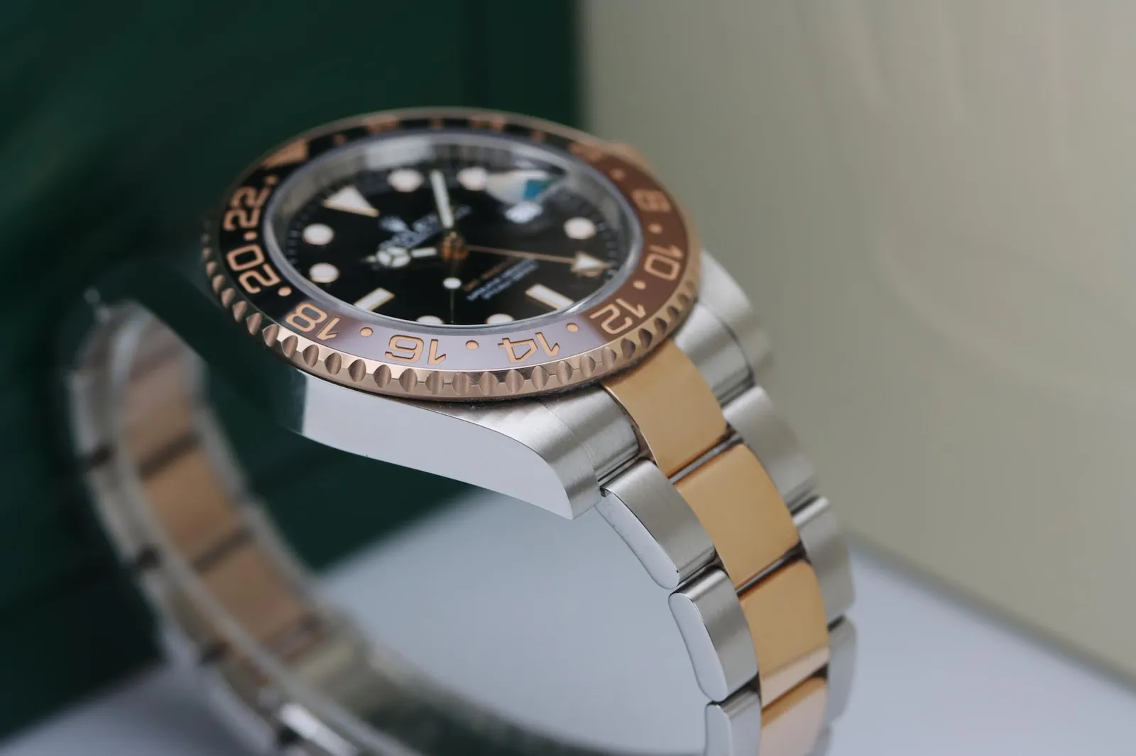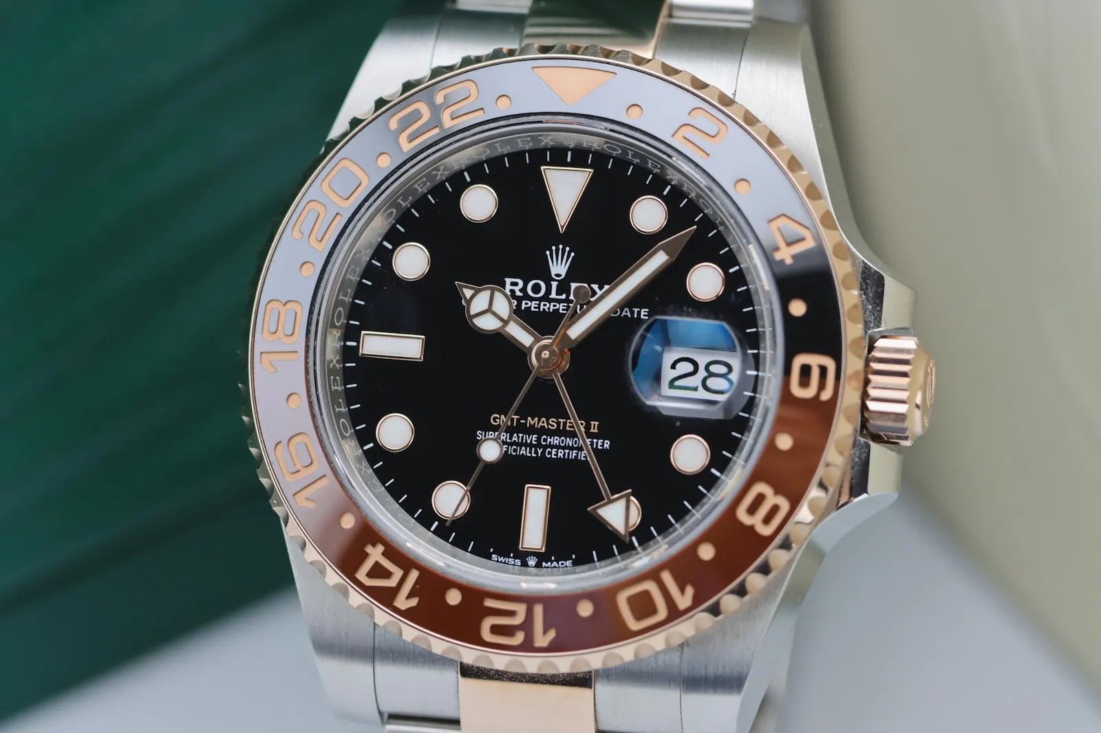The Rolex GMT-Master II 126711CHNR, known as the “Root Beer,” is a modern two-tone icon combining Oystersteel and 18ct Everose gold. With its distinctive black and brown Cerachrom ceramic bezel and elegant Oyster bracelet, the Root Beer is both a functional dual time zone tool watch and a statement piece.