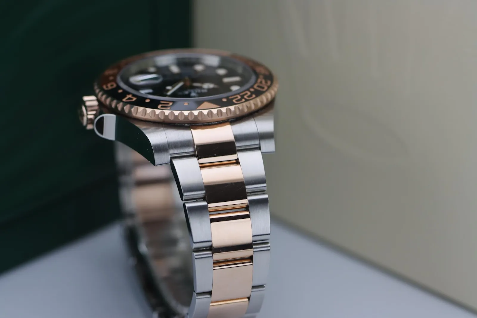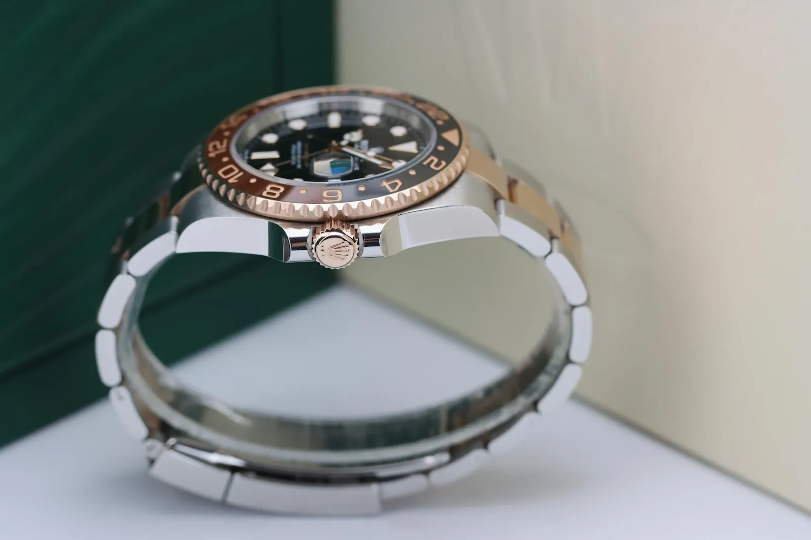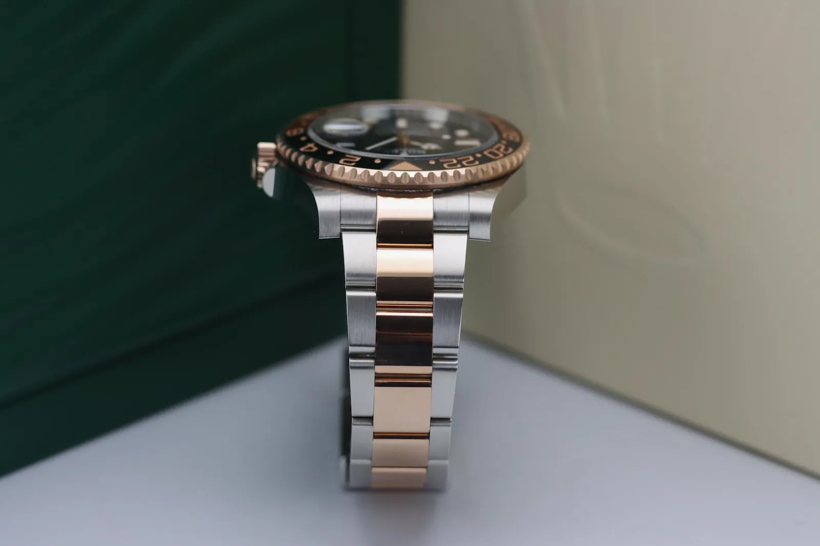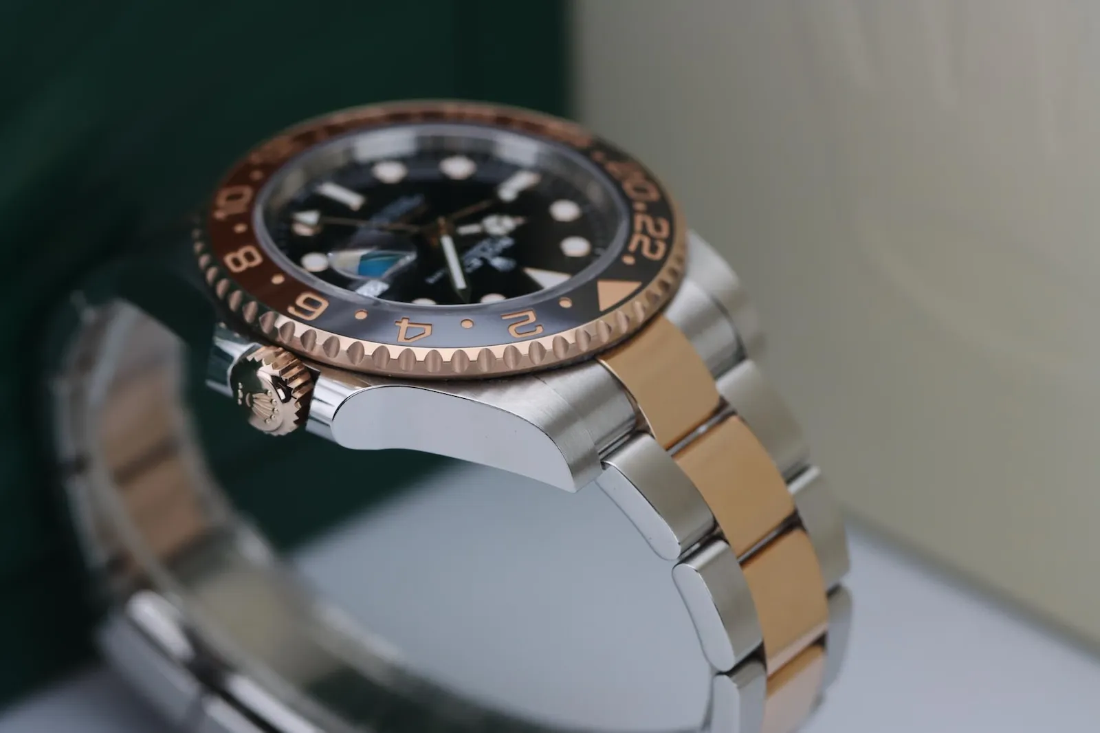 The Rolex GMT-Master II 126711CHNR, known as the “Root Beer,” is a modern two-tone icon combining Oystersteel and 18ct Everose gold. With its distinctive black and brown Cerachrom ceramic bezel and elegant Oyster bracelet, the Root Beer is both a functional dual time zone tool watch and a statement piece.