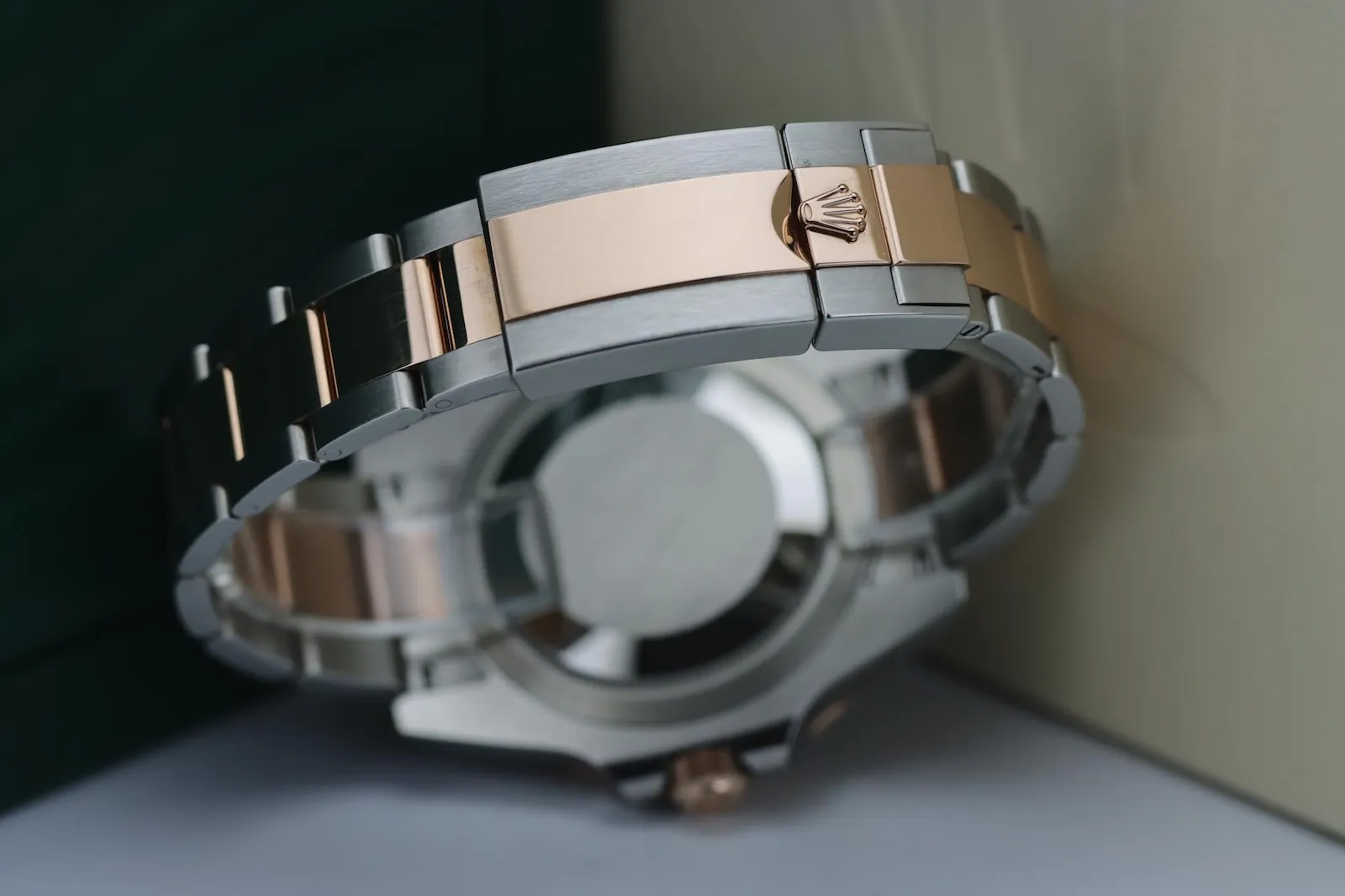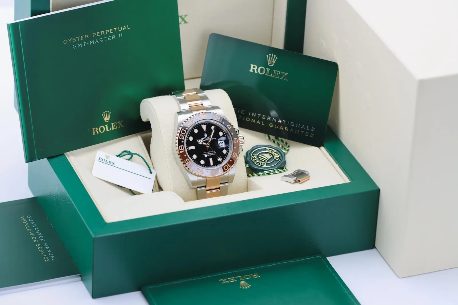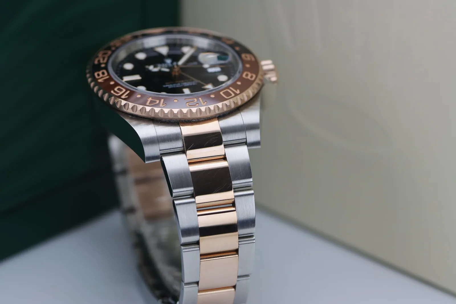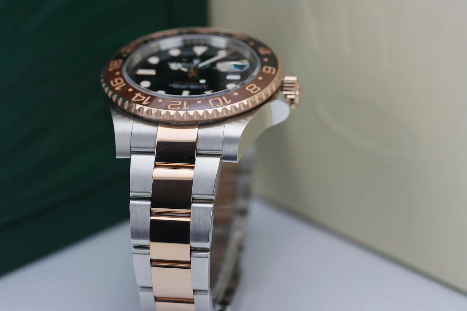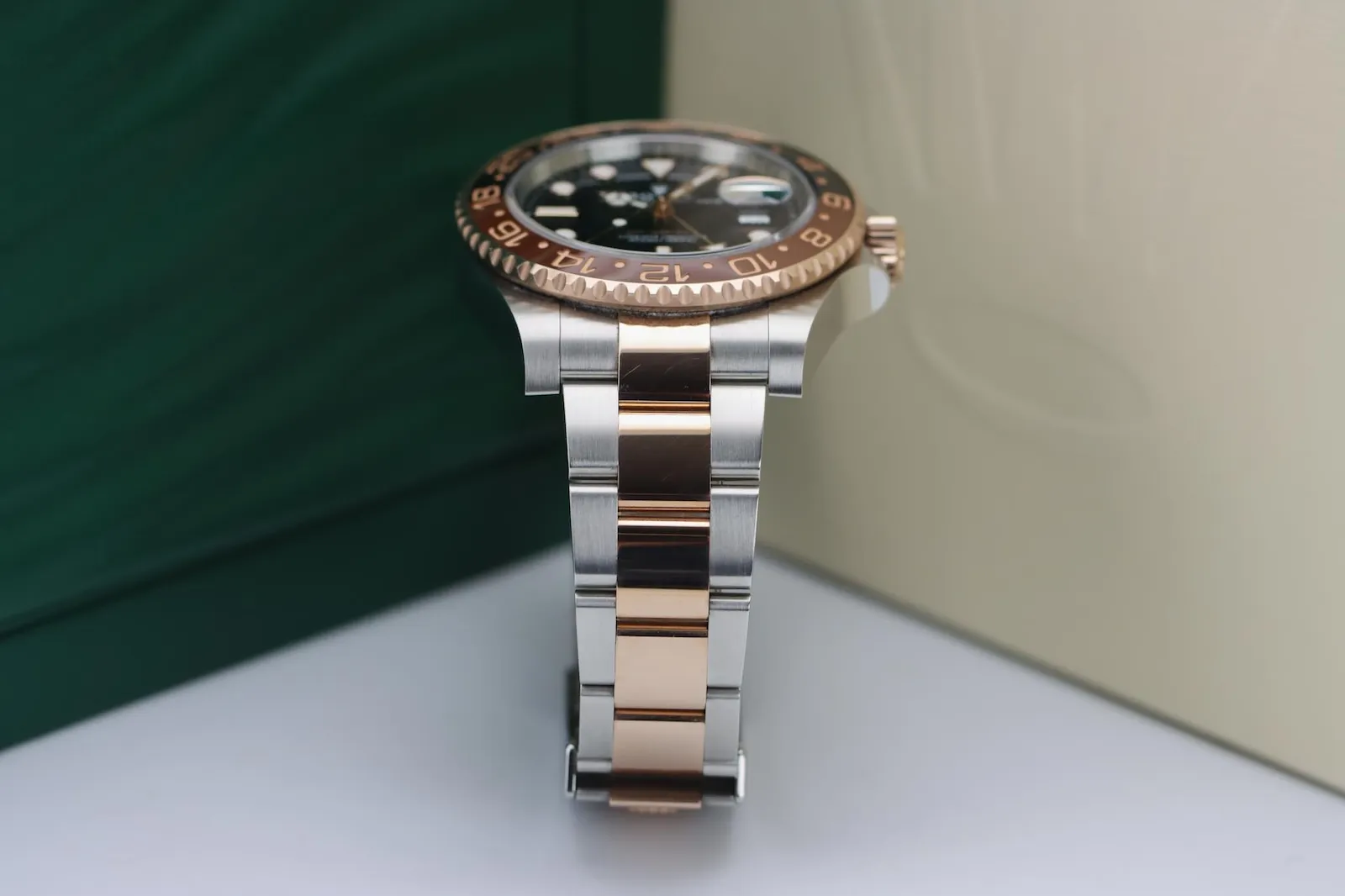 The Rolex GMT-Master II 126711CHNR, known as the “Root Beer,” is a modern two-tone icon combining Oystersteel and 18ct Everose gold. With its distinctive black and brown Cerachrom ceramic bezel and elegant Oyster bracelet, the Root Beer is both a functional dual time zone tool watch and a statement piece.